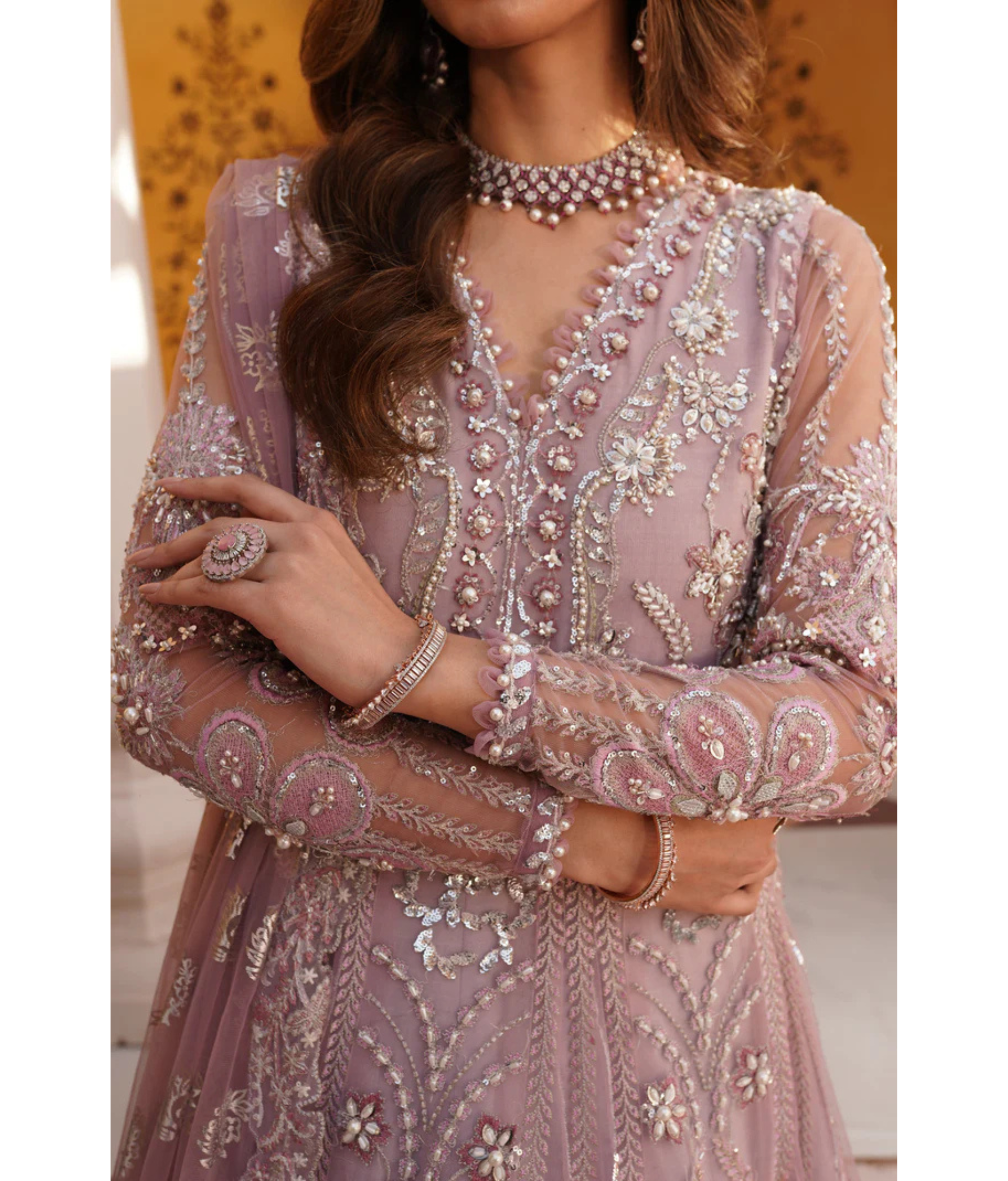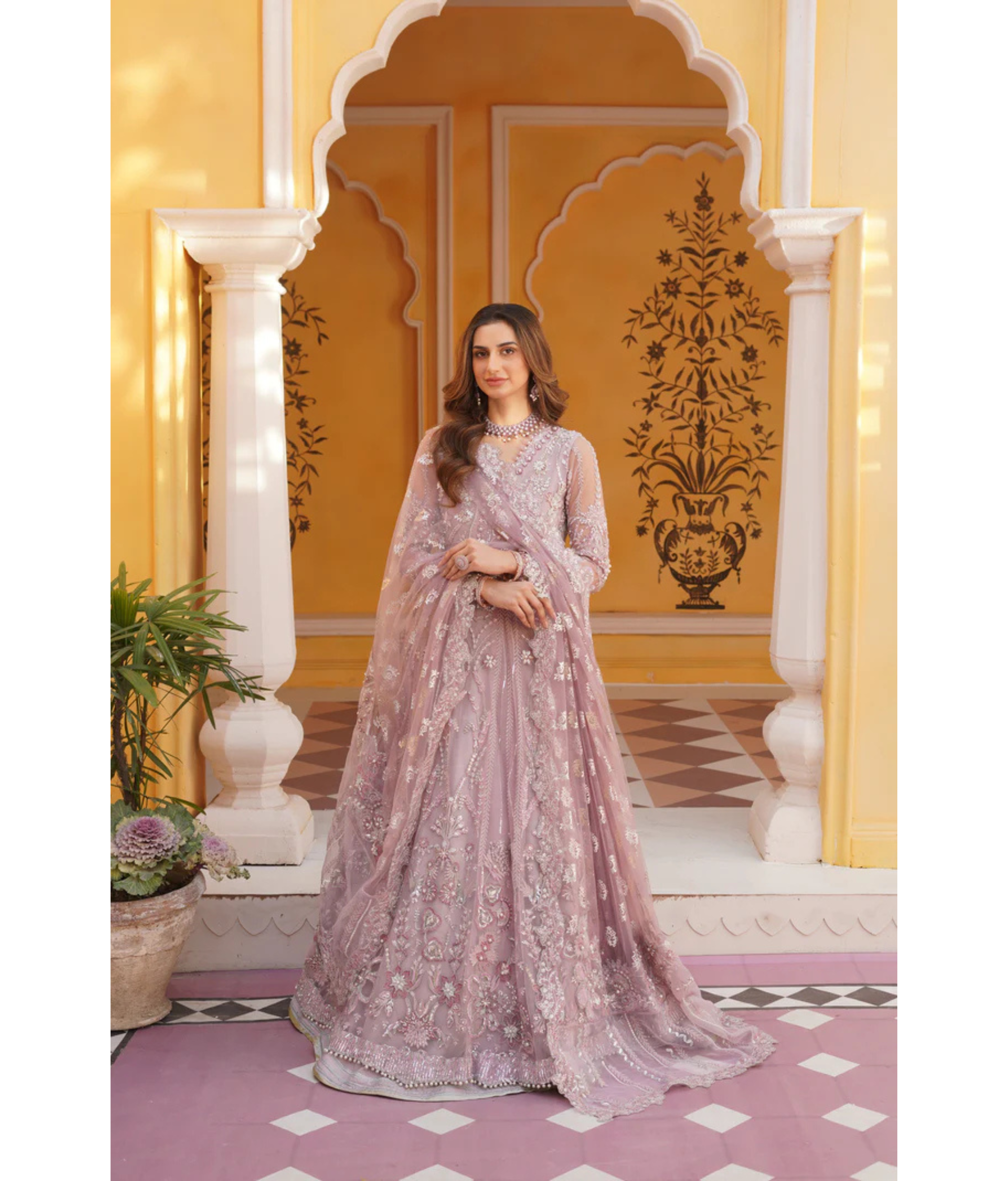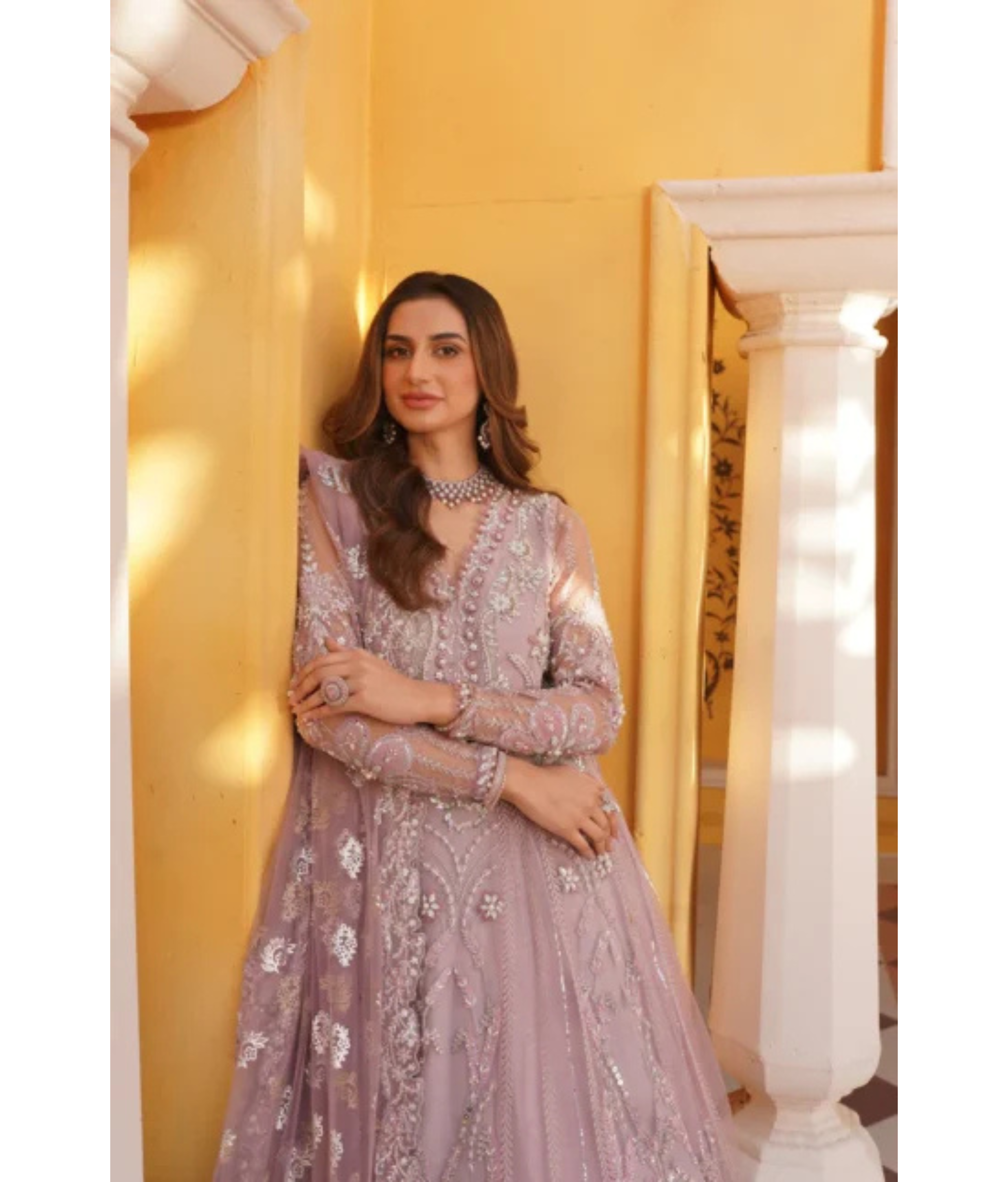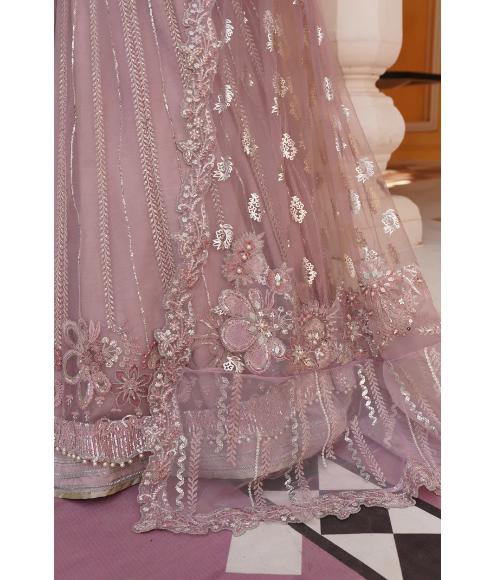 Indulge in the enchanting beauty of the Purple Pishwas, a masterpiece crafted with the finest net fabric and adorned with exquisite handwork embroidery. The delicate net fabric used in the creation of this beautiful Pishwas adds an ethereal touch, draping the wearer in a soft and graceful manner. Each meticulously crafted stitch showcases the expertise and dedication of skilled artisans, creating an ensemble that is nothing short of a work of art. This captivating ensemble exudes a royal traditional charm, making it a stunning article that captures the essence of timeless elegance.