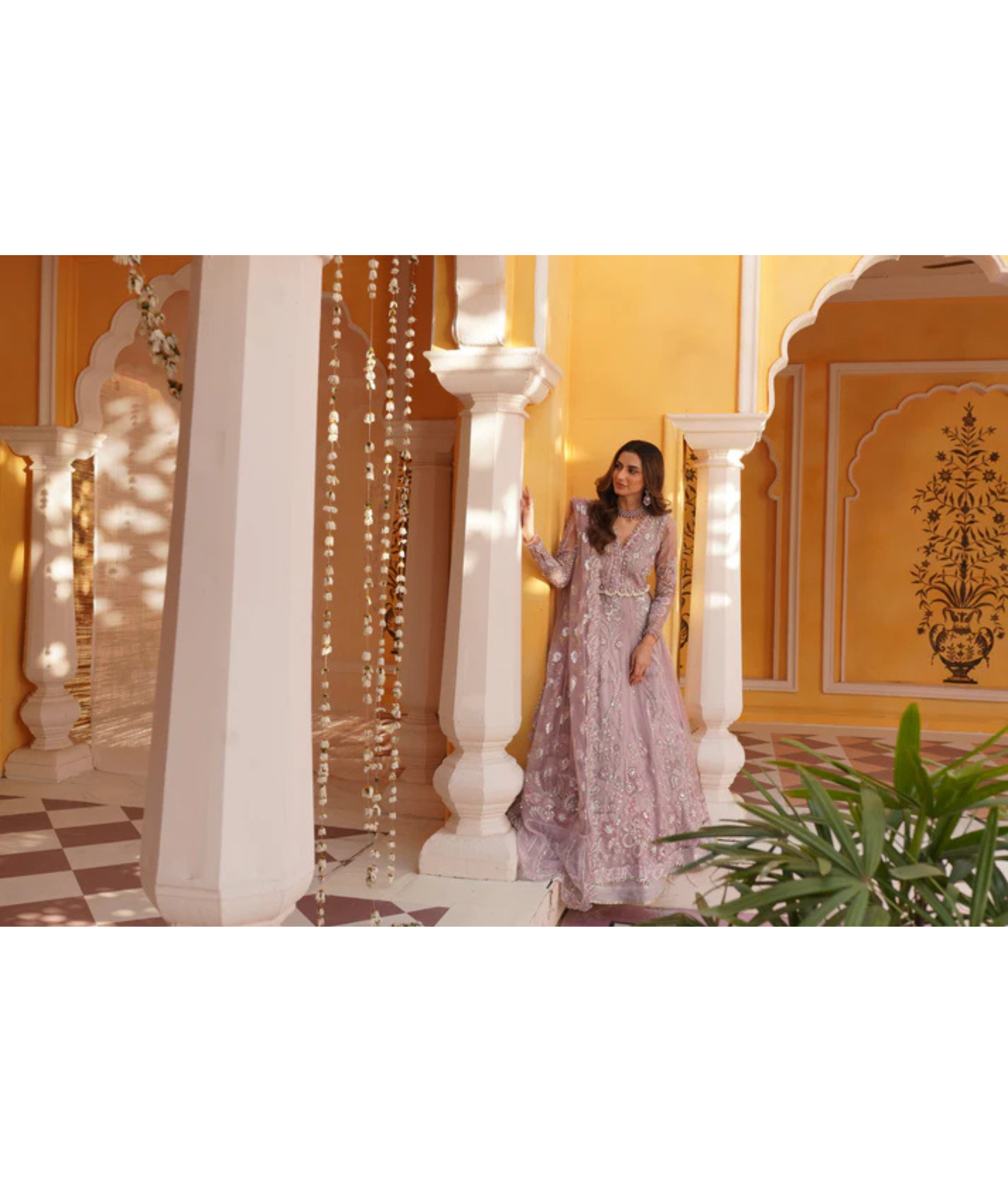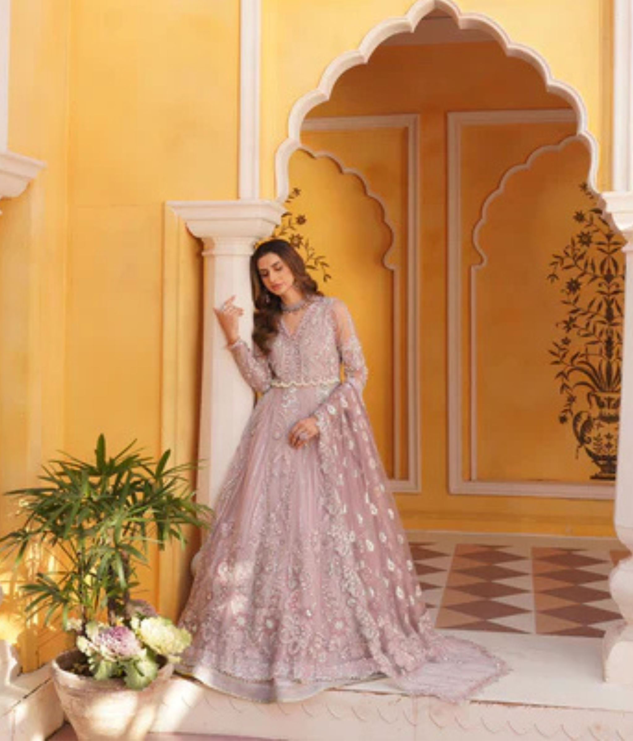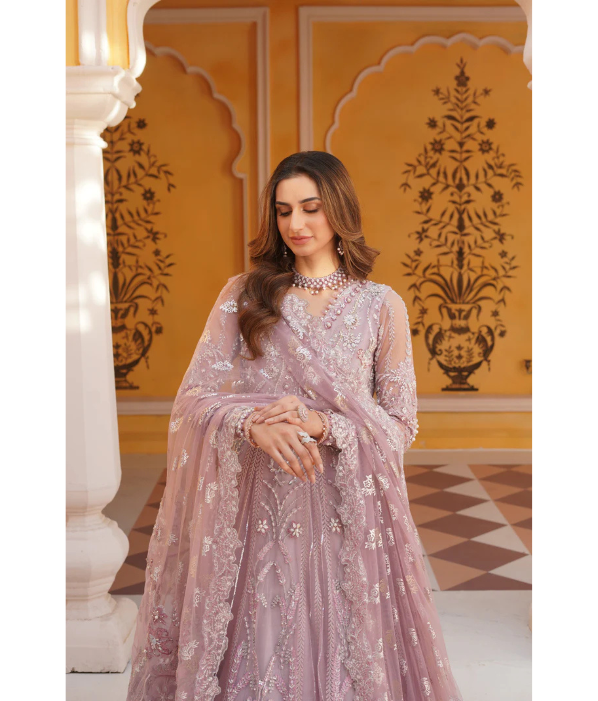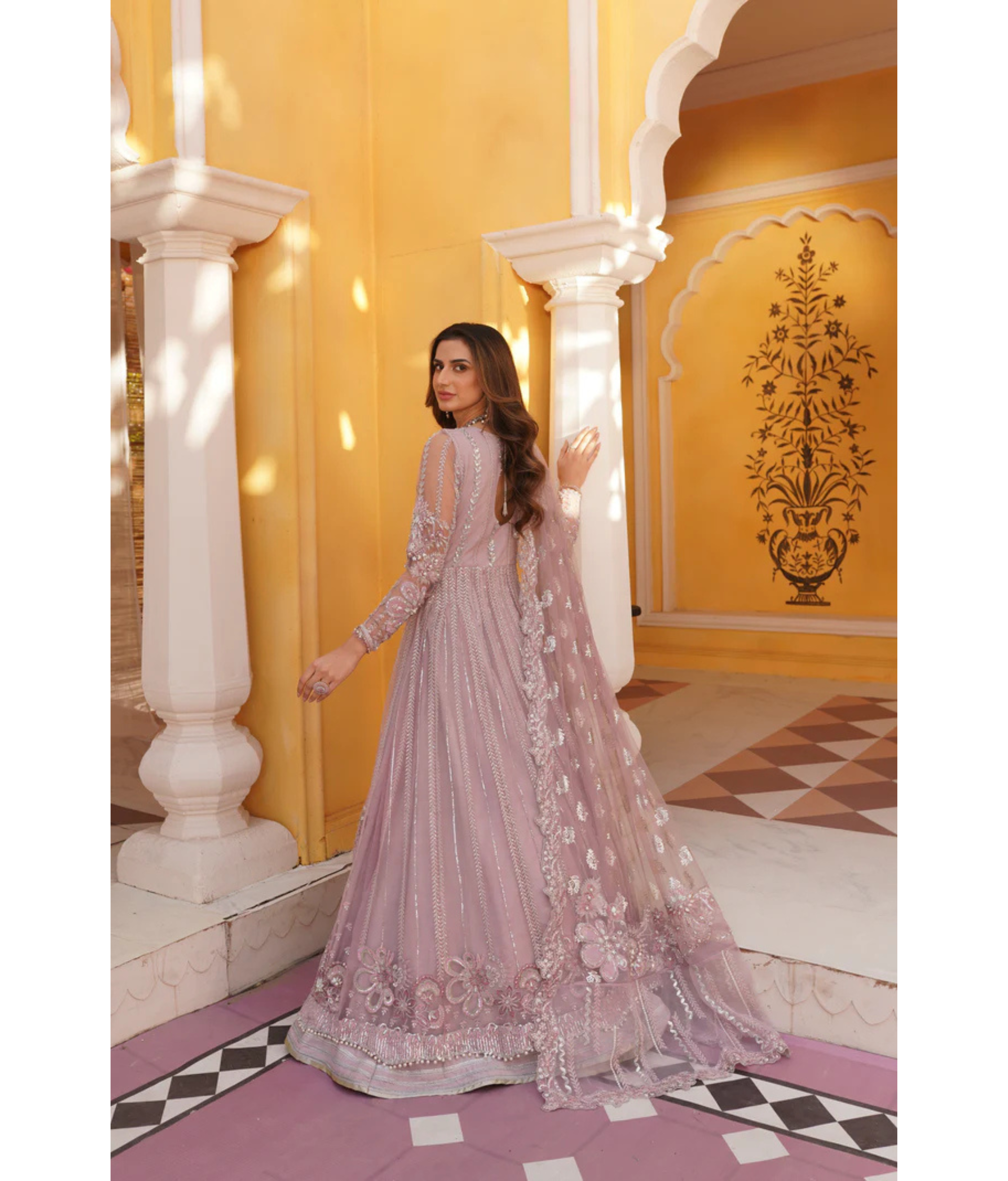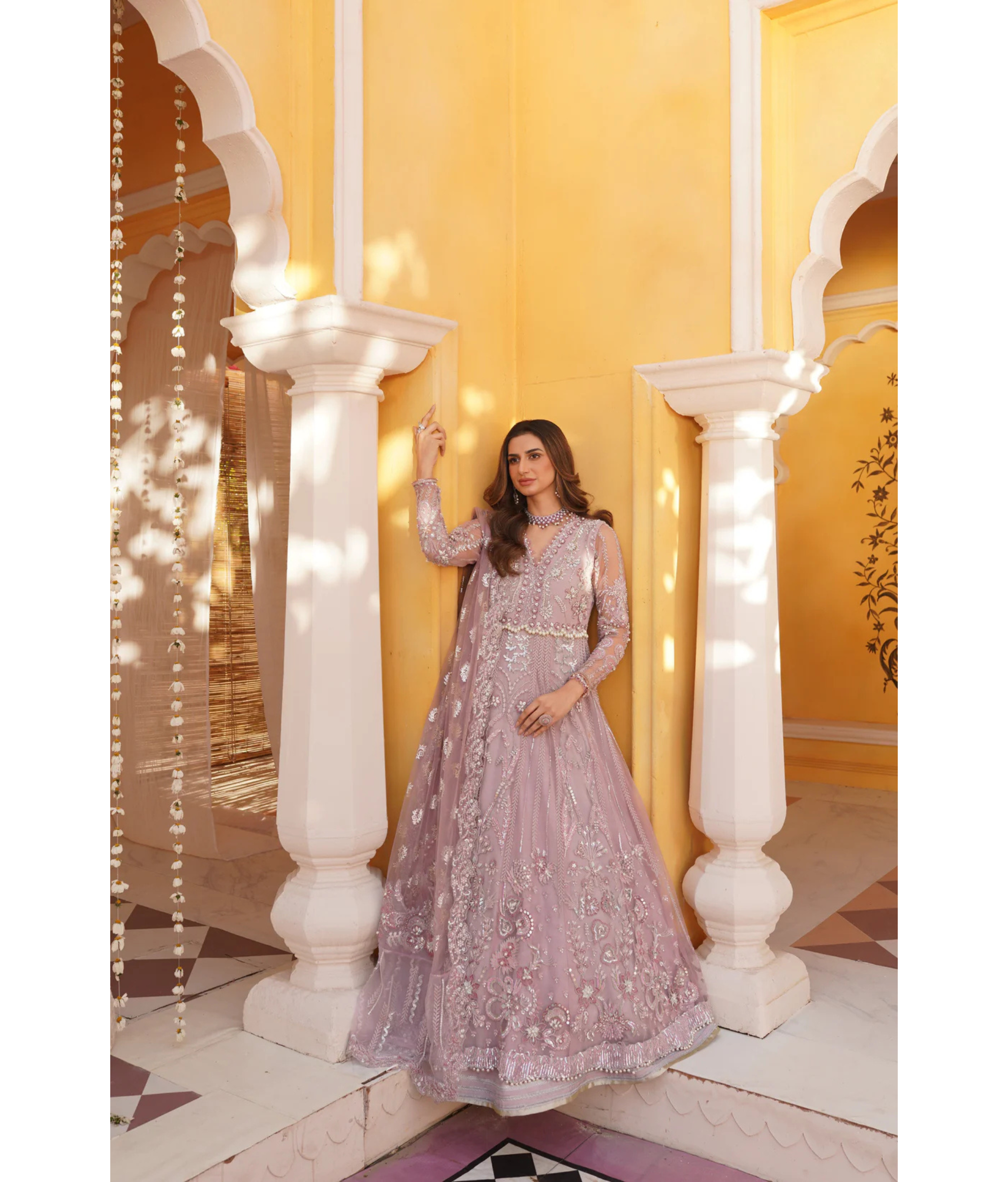 Indulge in the enchanting beauty of the Purple Pishwas, a masterpiece crafted with the finest net fabric and adorned with exquisite handwork embroidery. The delicate net fabric used in the creation of this beautiful Pishwas adds an ethereal touch, draping the wearer in a soft and graceful manner. Each meticulously crafted stitch showcases the expertise and dedication of skilled artisans, creating an ensemble that is nothing short of a work of art. This captivating ensemble exudes a royal traditional charm, making it a stunning article that captures the essence of timeless elegance.