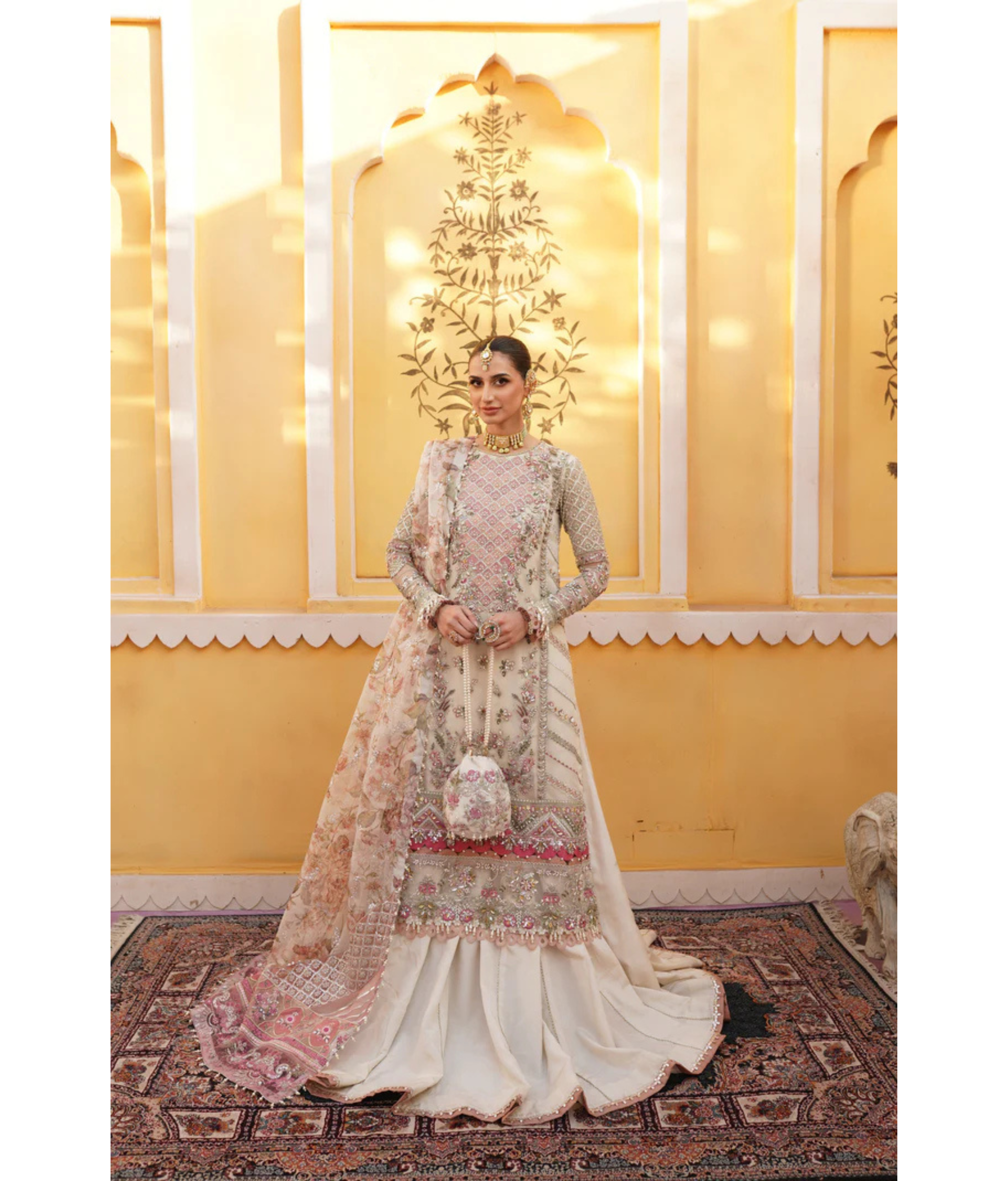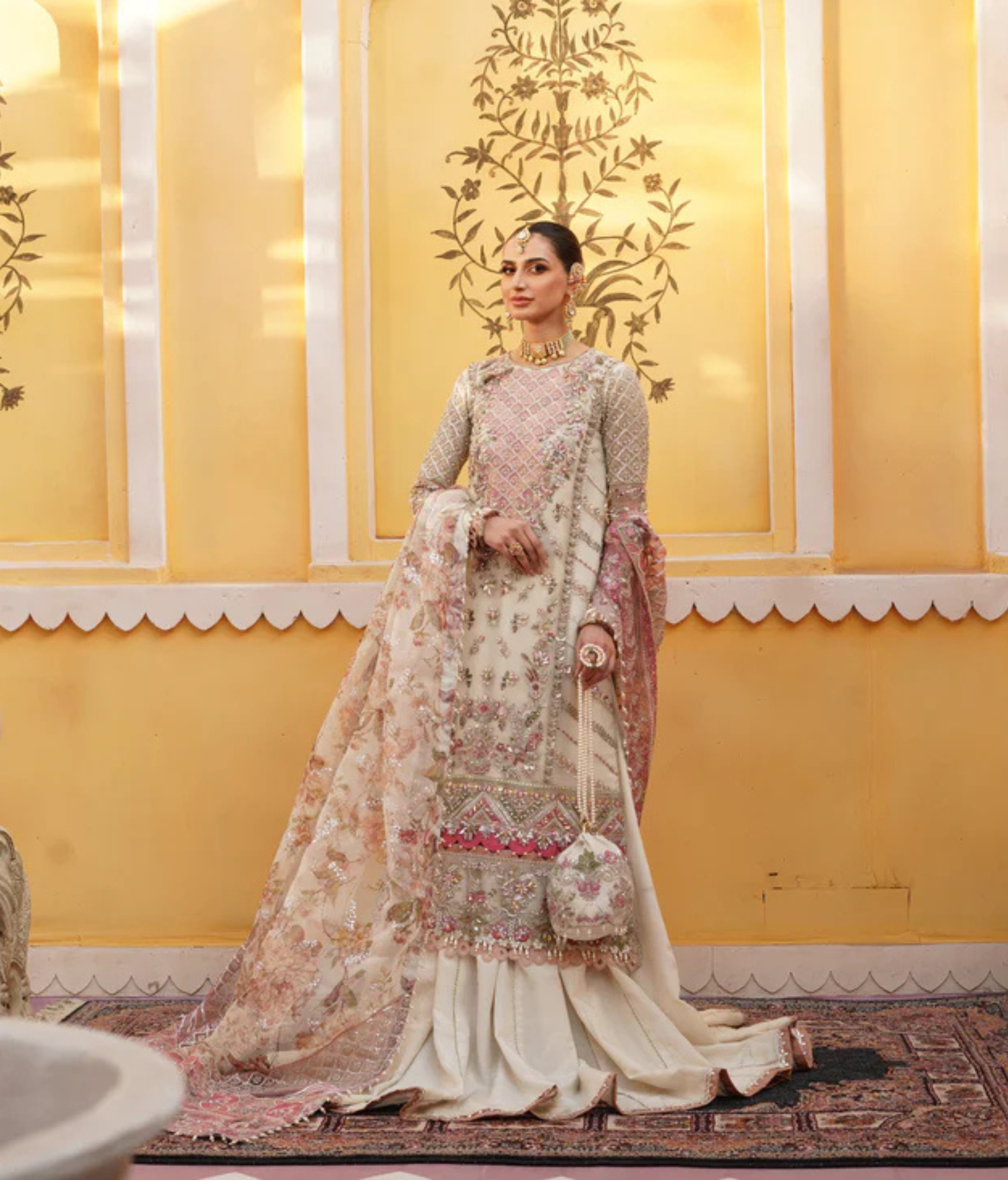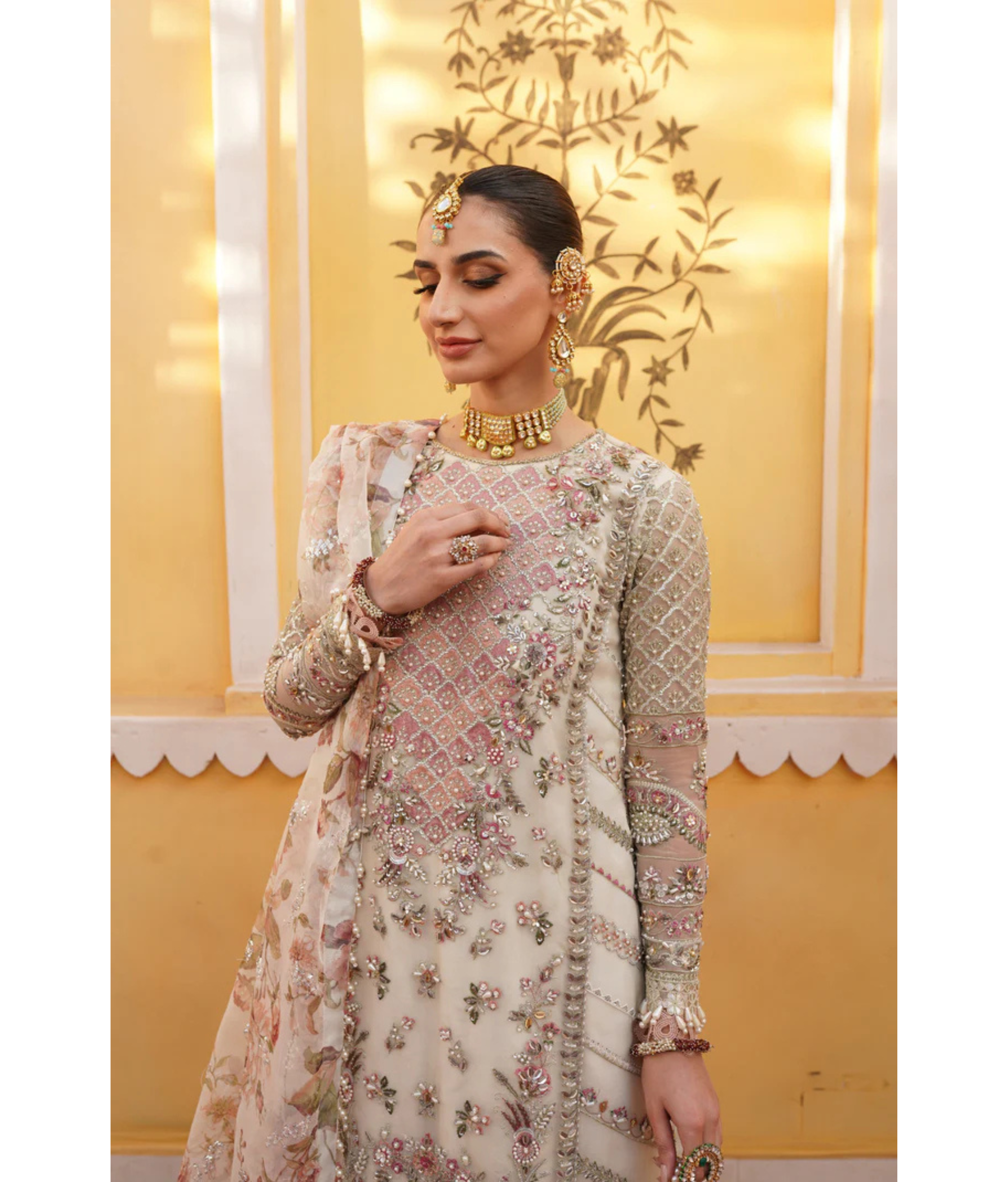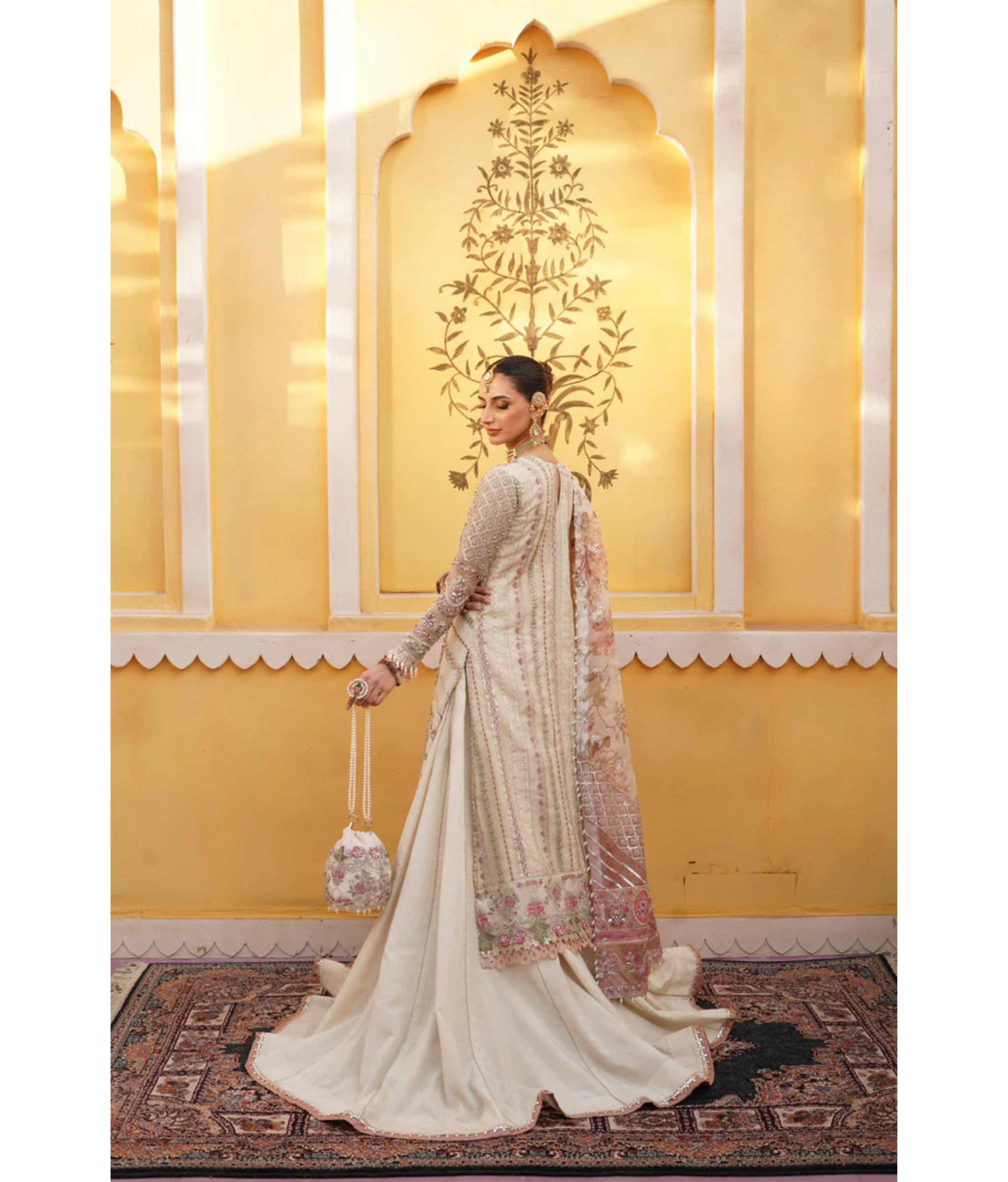 Its timeless appeal and intricate handwork embroidery set it apart from the ordinary, allowing you to stand out with grace and elegance. Its pristine white color symbolizes purity and innocence. Whether you’re attending a wedding, formal event, or any special occasion, the ‘Baad-e-Saba’ dress is sure to make a statement.