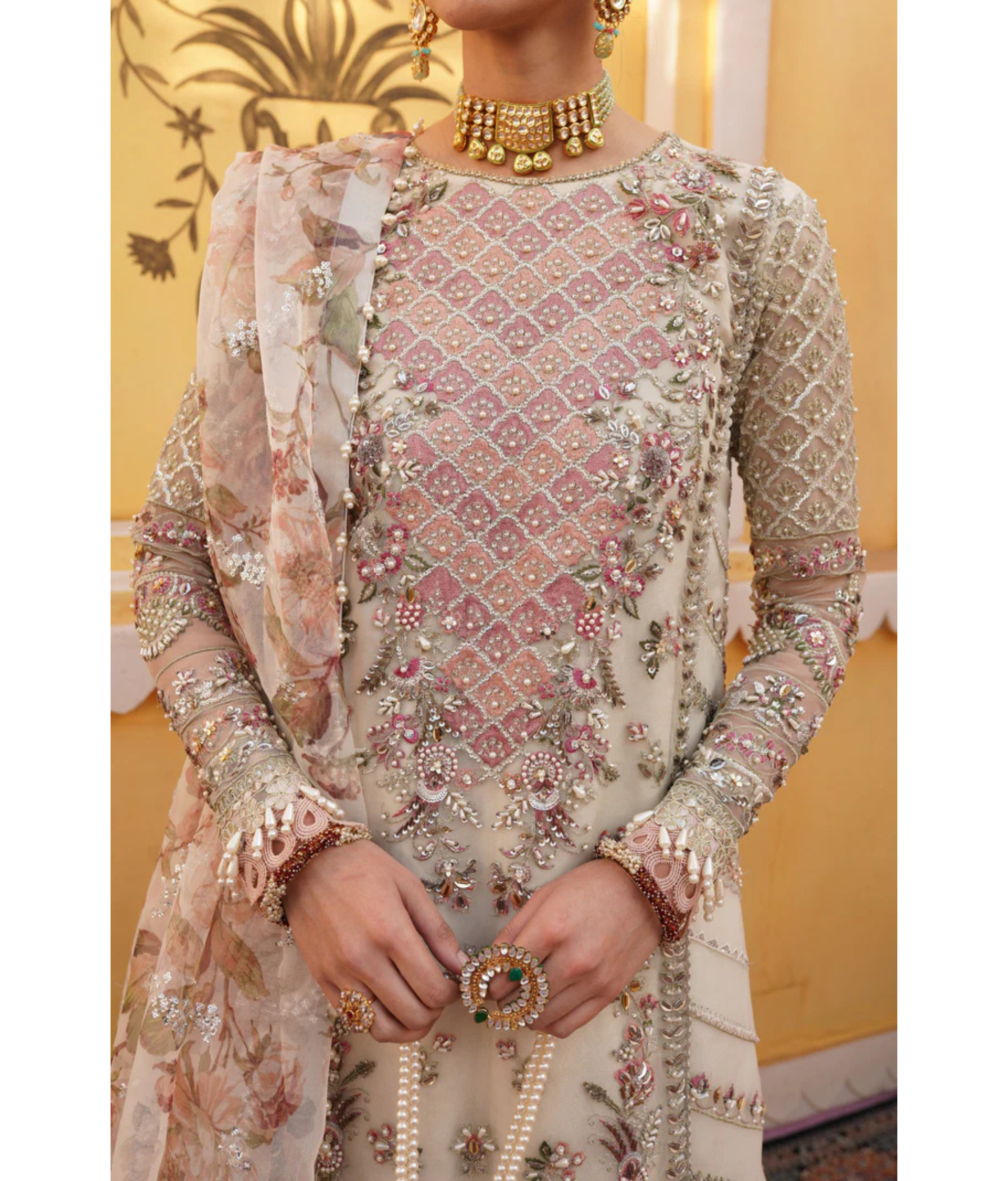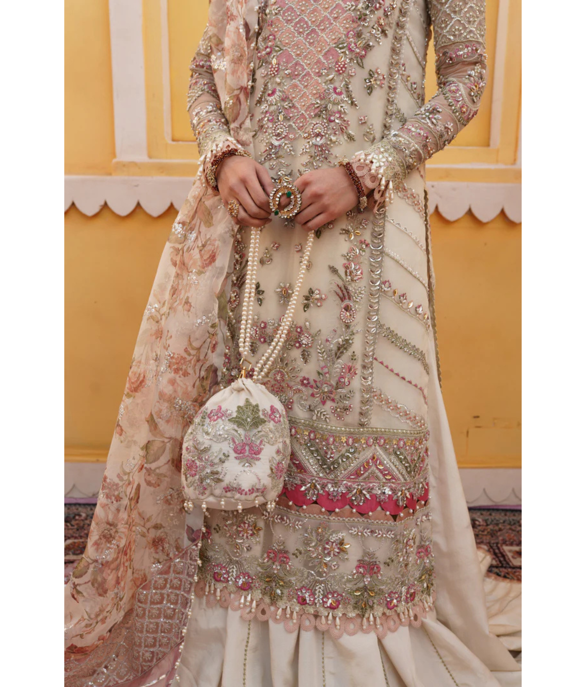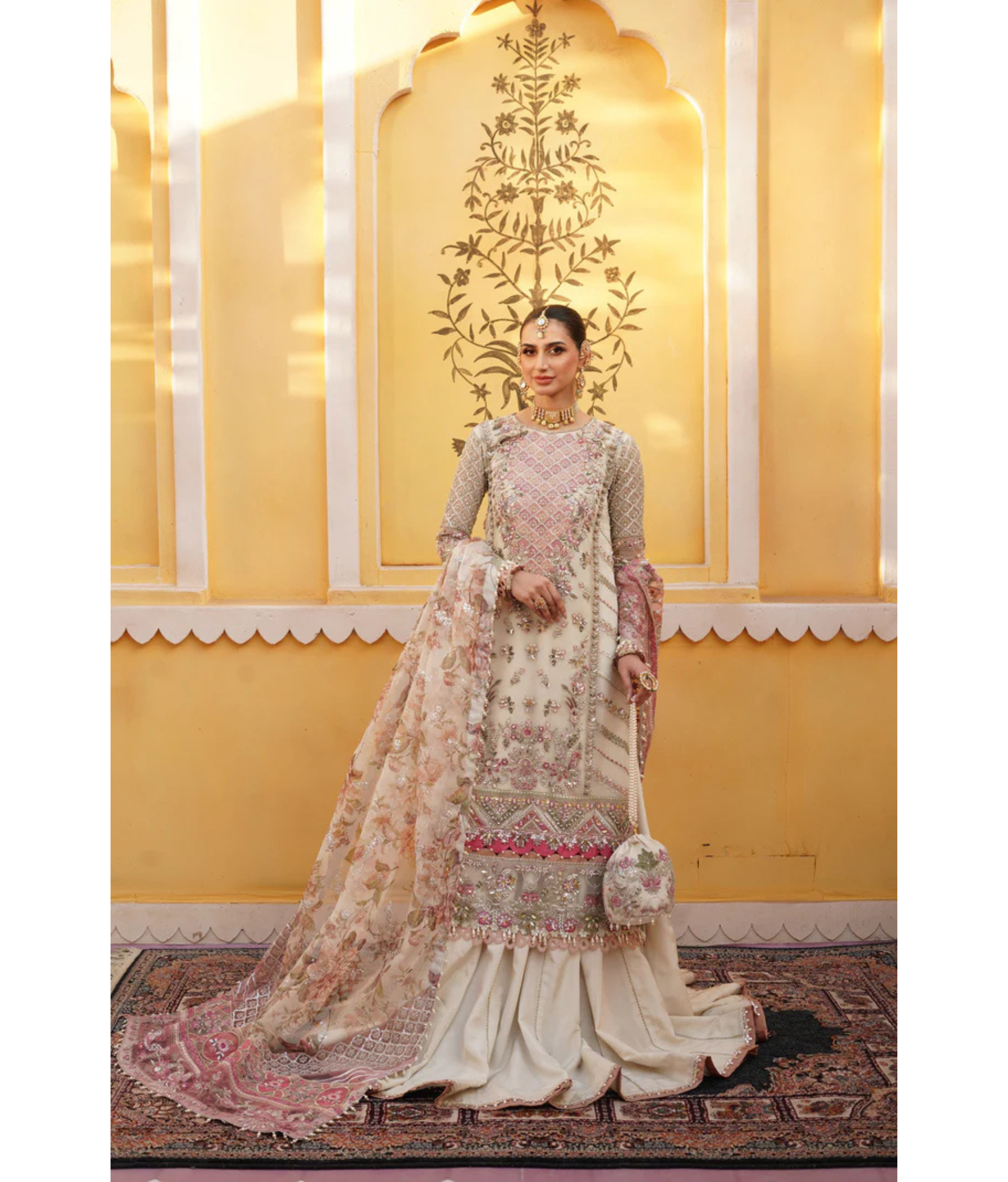 Its timeless appeal and intricate handwork embroidery set it apart from the ordinary, allowing you to stand out with grace and elegance. Its pristine white color symbolizes purity and innocence. Whether you’re attending a wedding, formal event, or any special occasion, the ‘Baad-e-Saba’ dress is sure to make a statement.