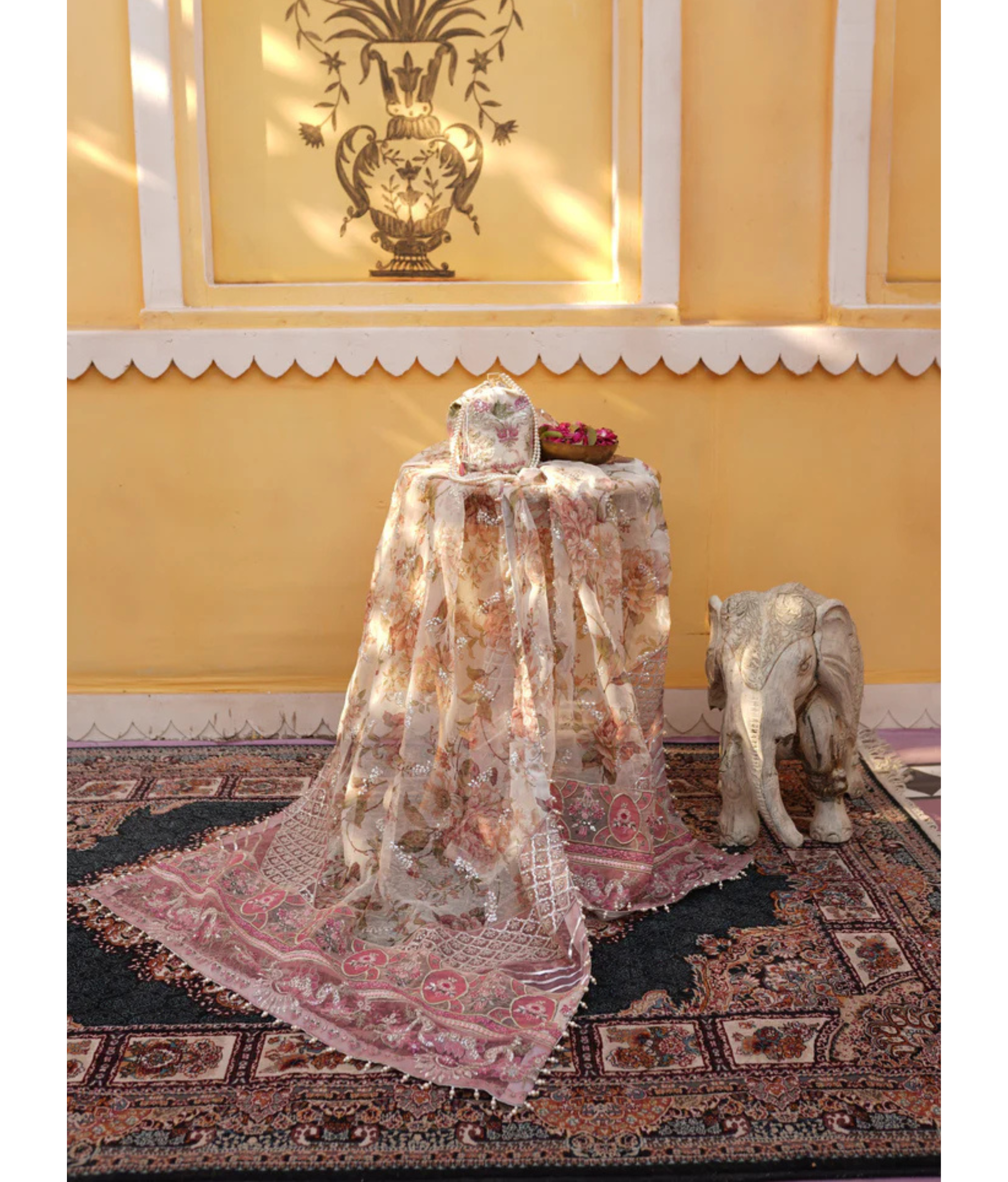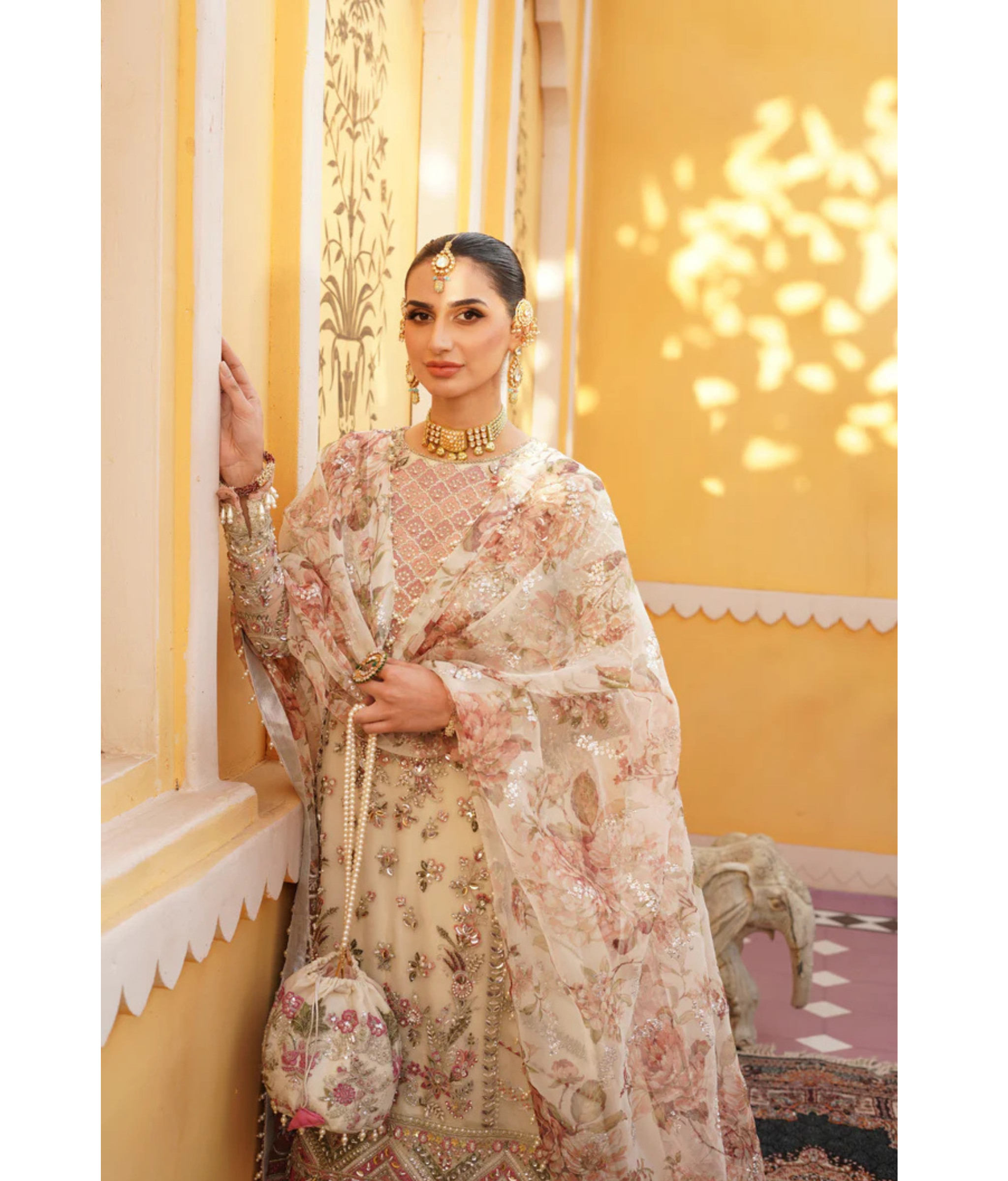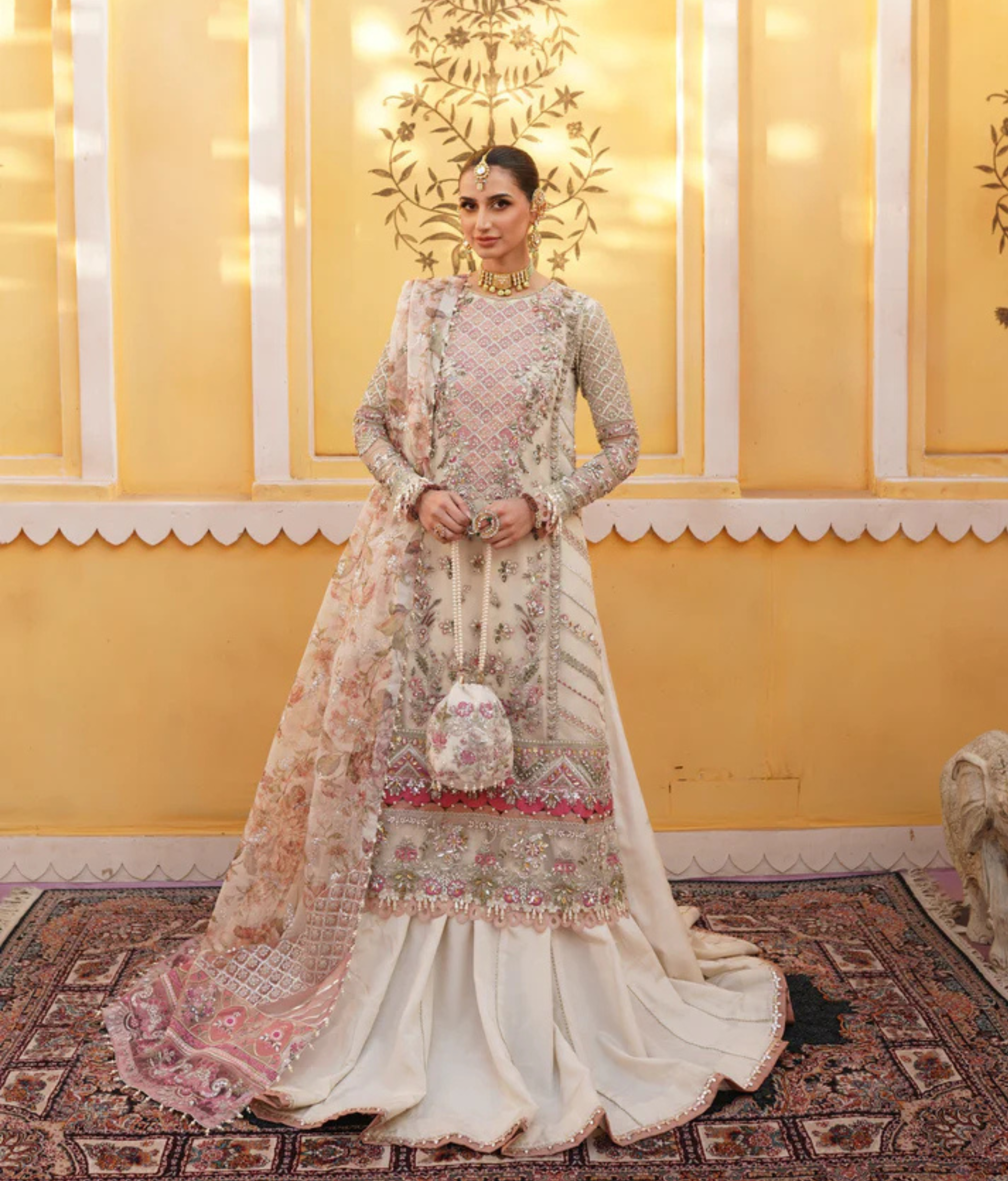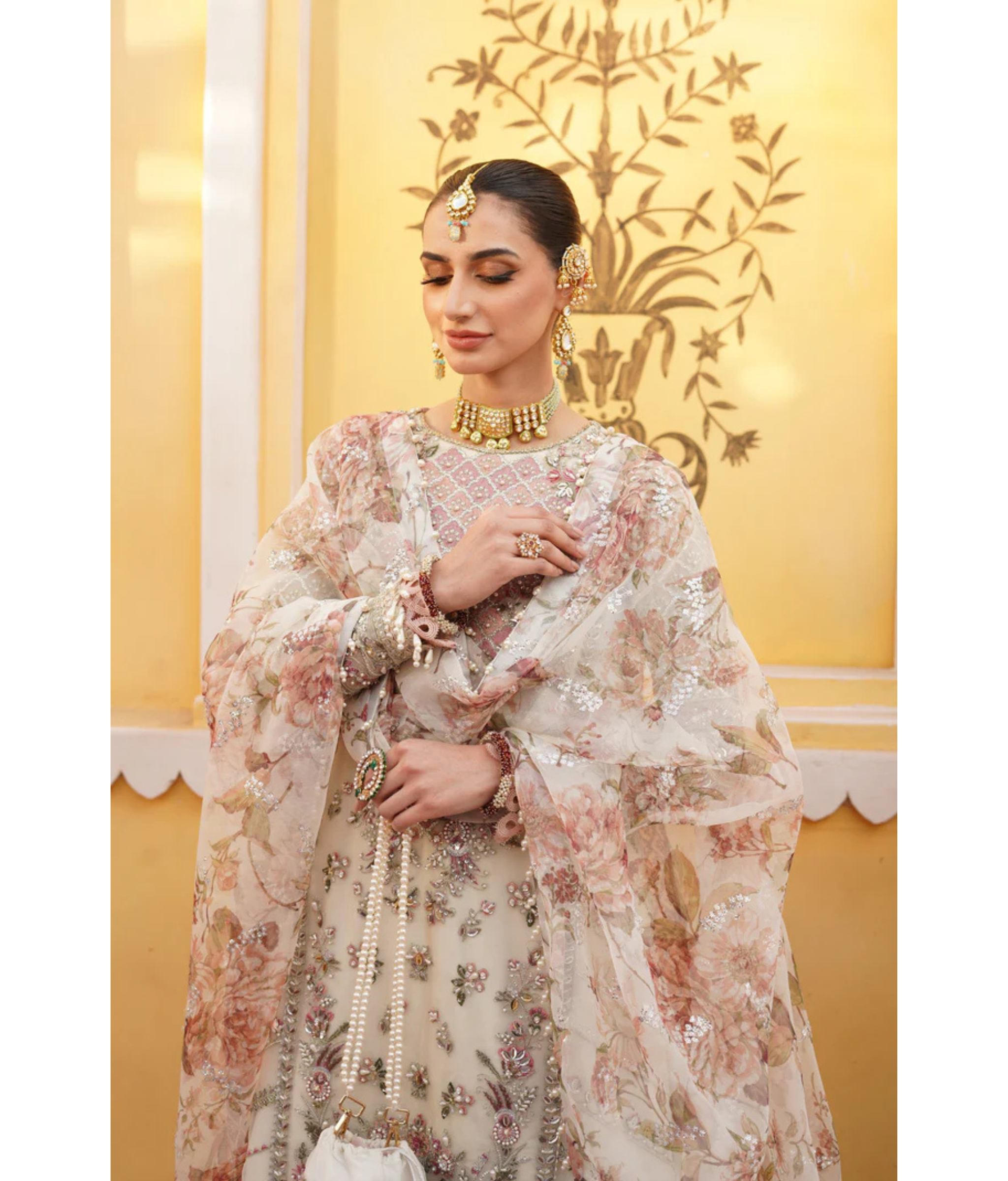 Its timeless appeal and intricate handwork embroidery set it apart from the ordinary, allowing you to stand out with grace and elegance. Its pristine white color symbolizes purity and innocence. Whether you’re attending a wedding, formal event, or any special occasion, the ‘Baad-e-Saba’ dress is sure to make a statement.
