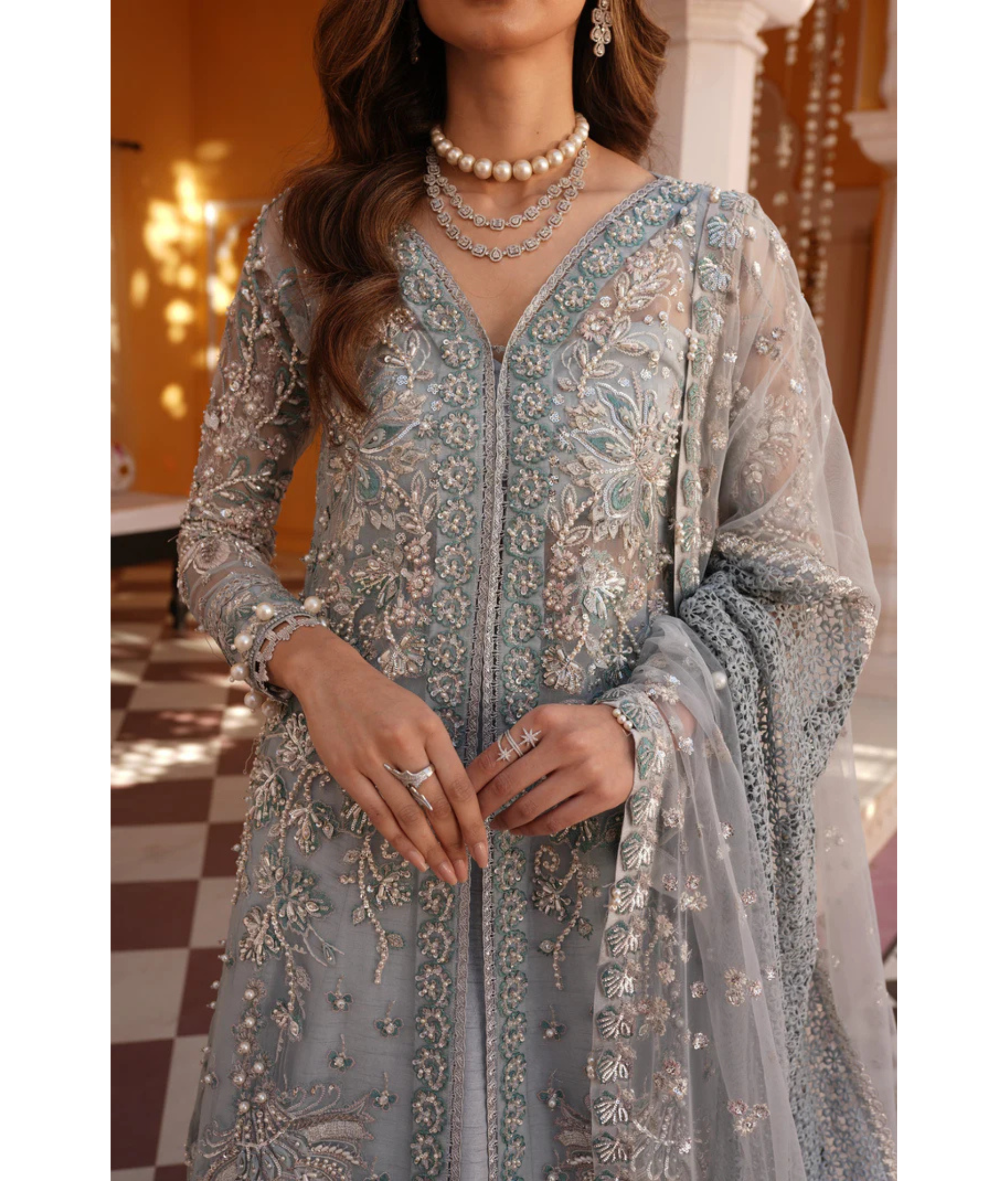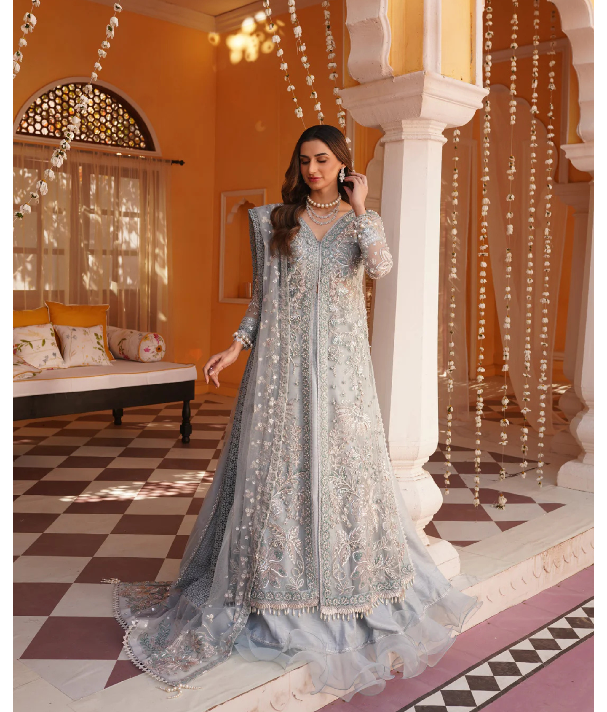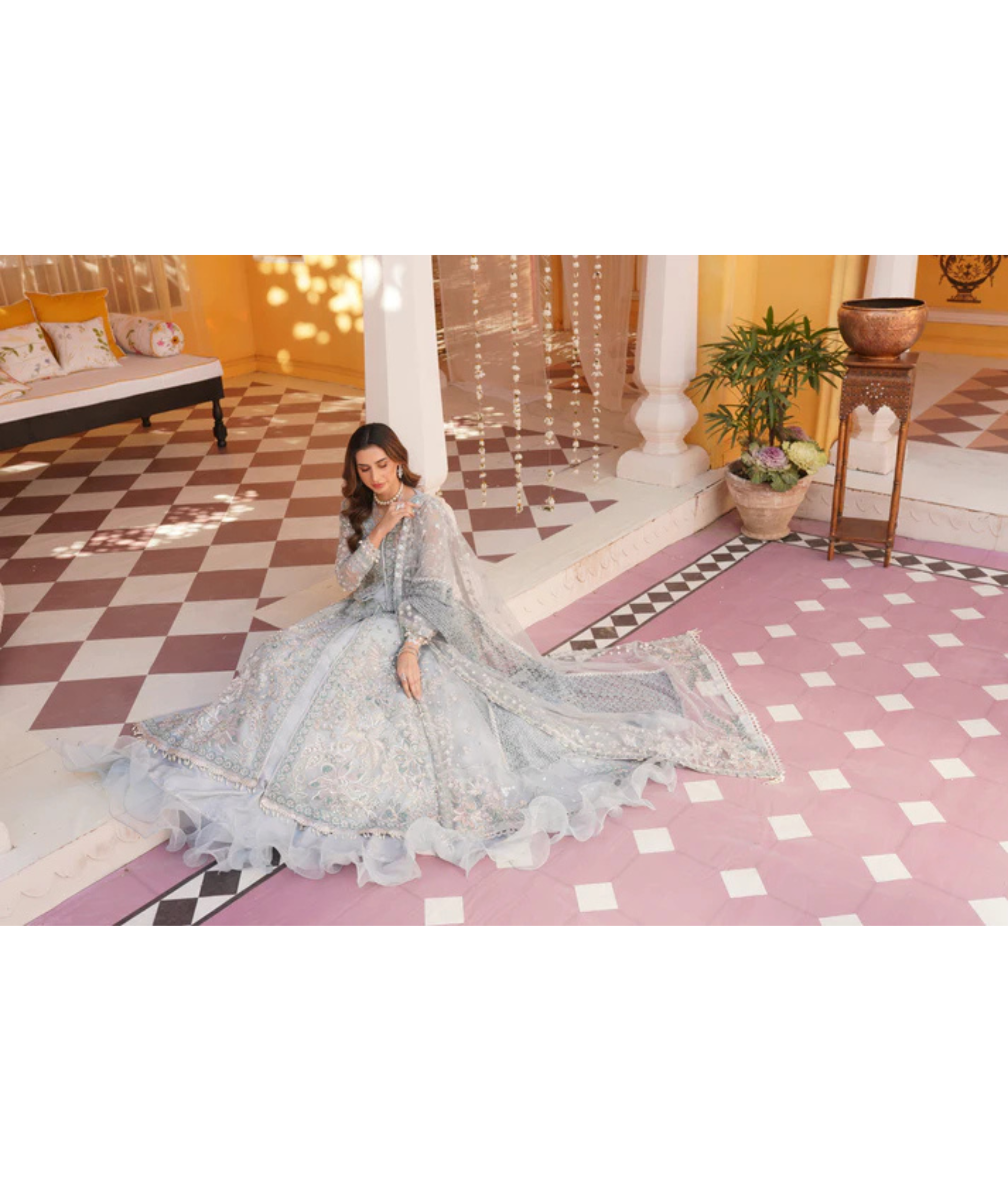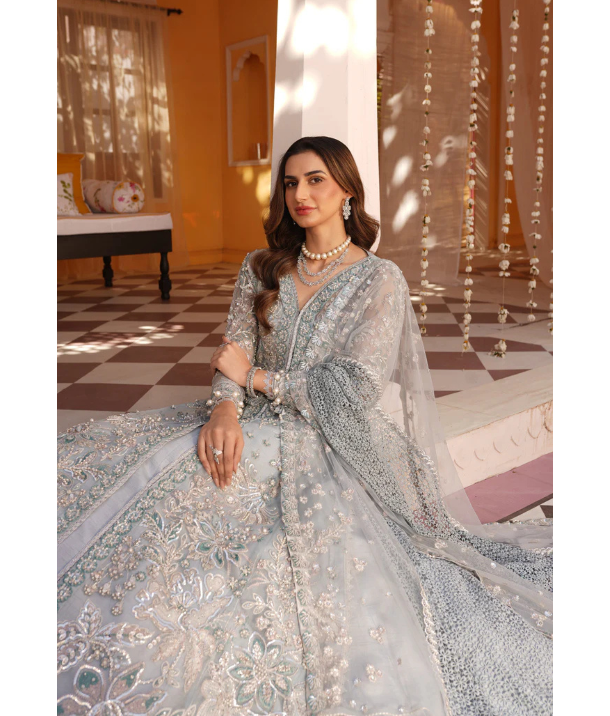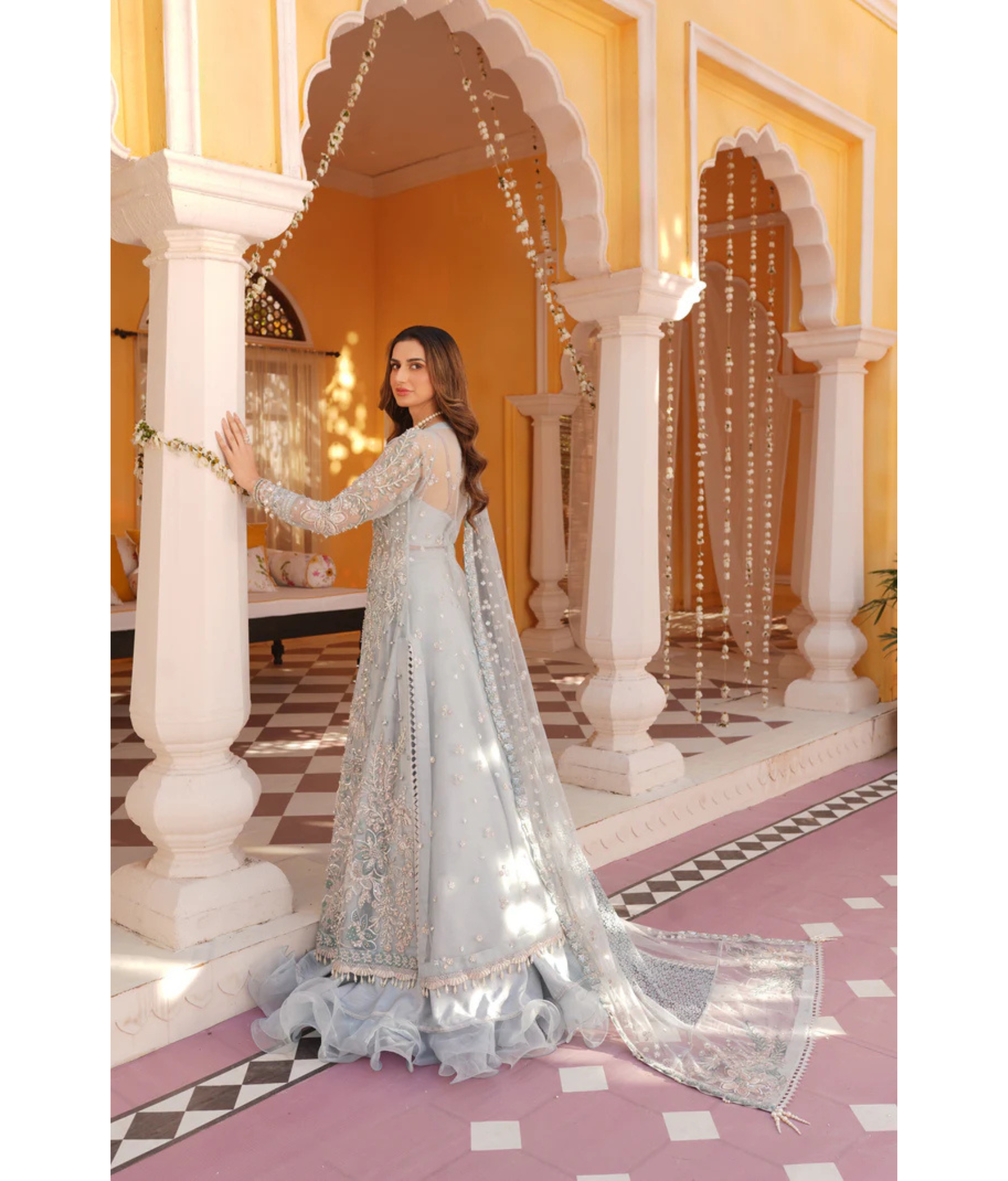Mariam Malik introducing this beautiful dress crafted with the finest ice blue organza fabric, exquisitely adorned with intricate embroidery and meticulous handwork. This elegant ensemble effortlessly blends traditional motives with contemporary designs. “Mahi Mir” is a true work of art, meticulously crafted with attention to every detail. It is perfect for special occasions, formal events, or as a statement piece for those seeking to make a lasting impression.