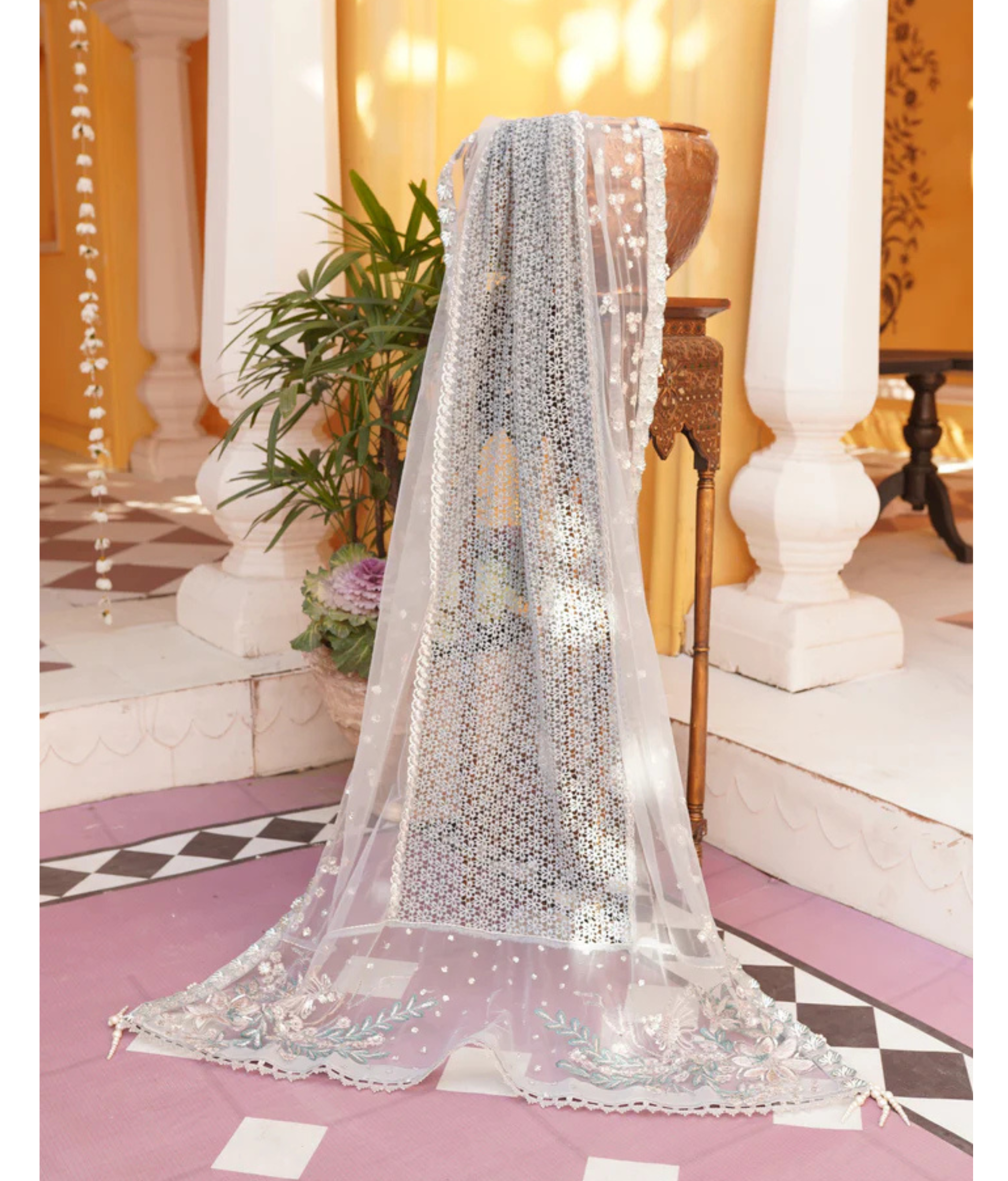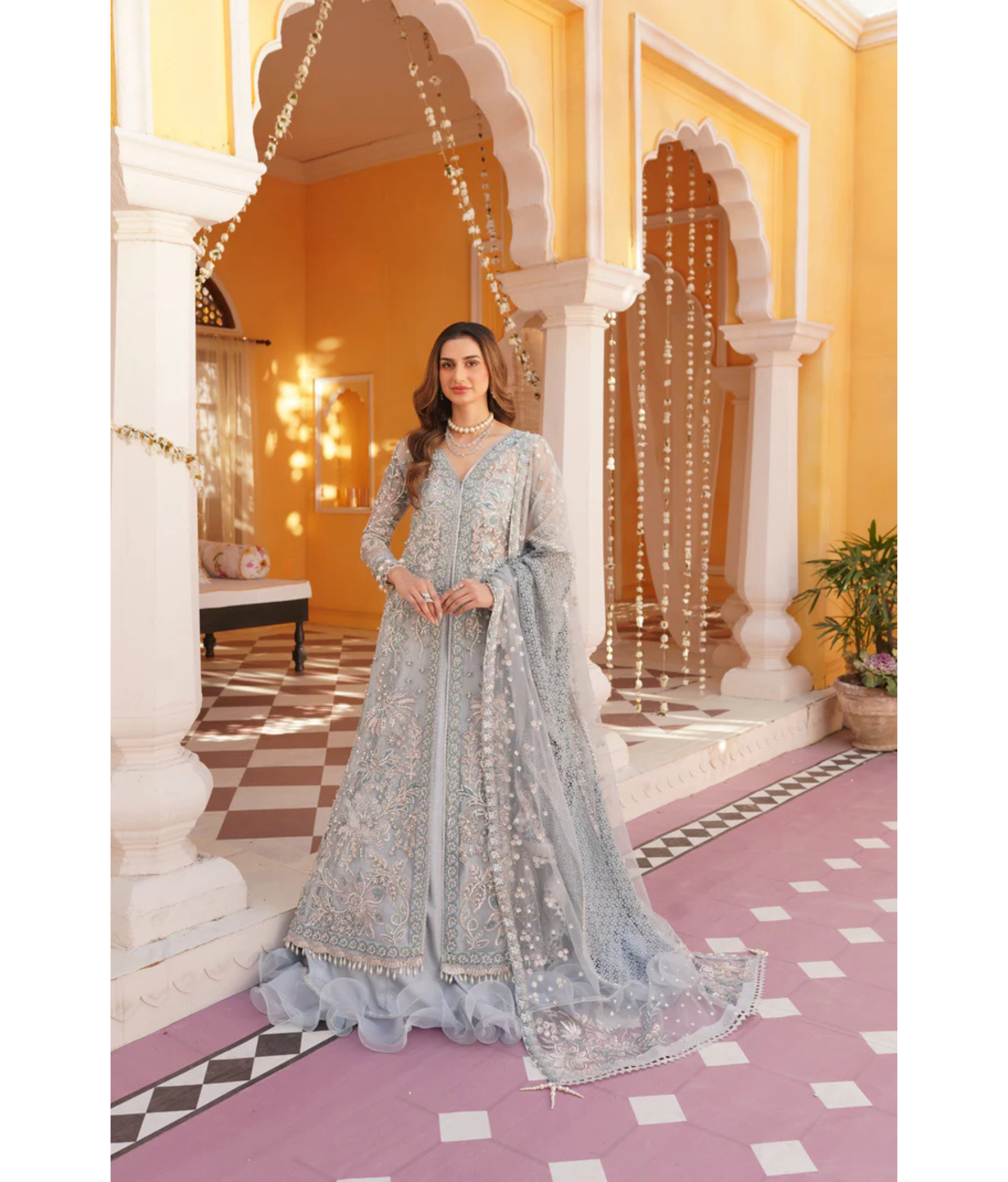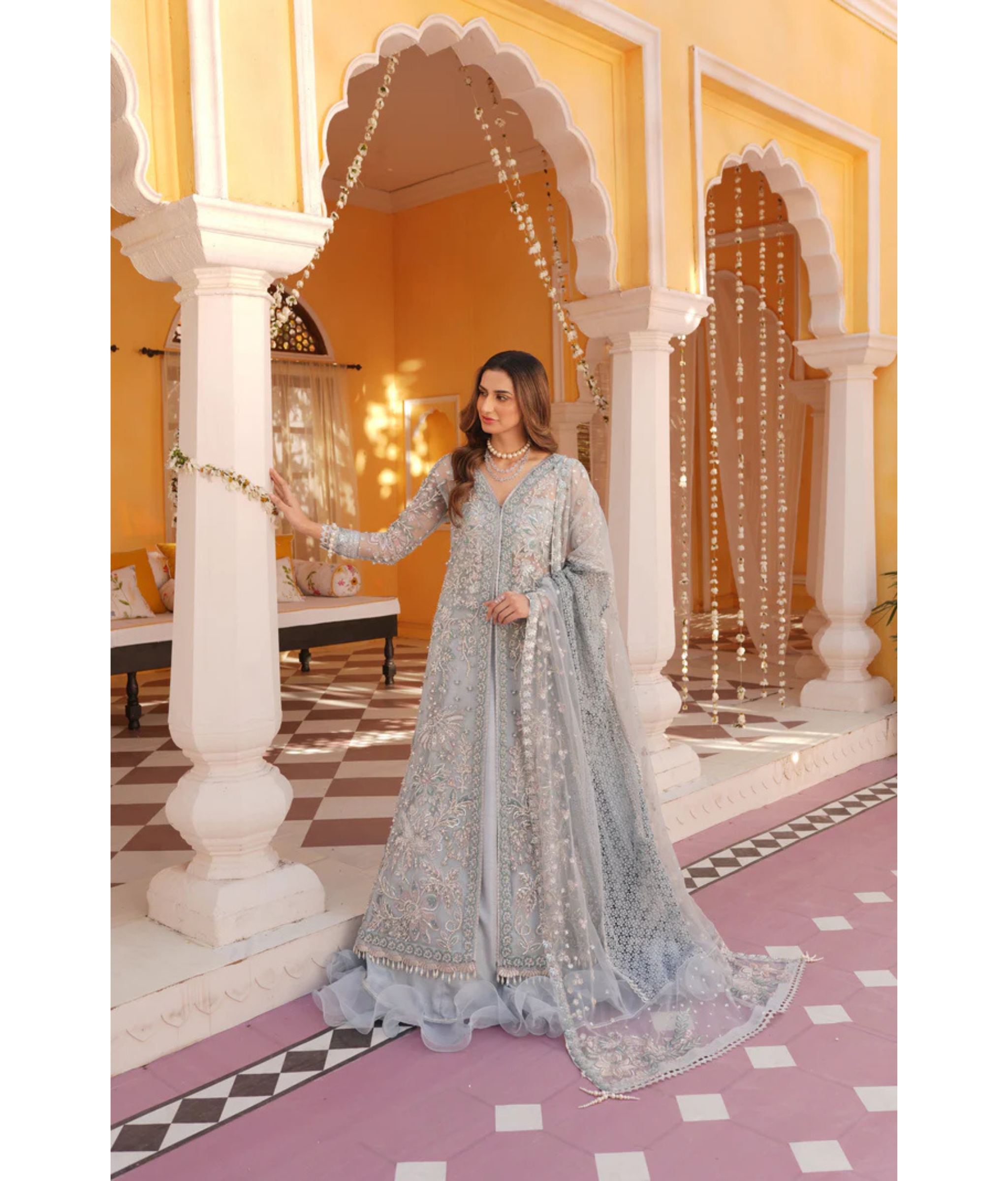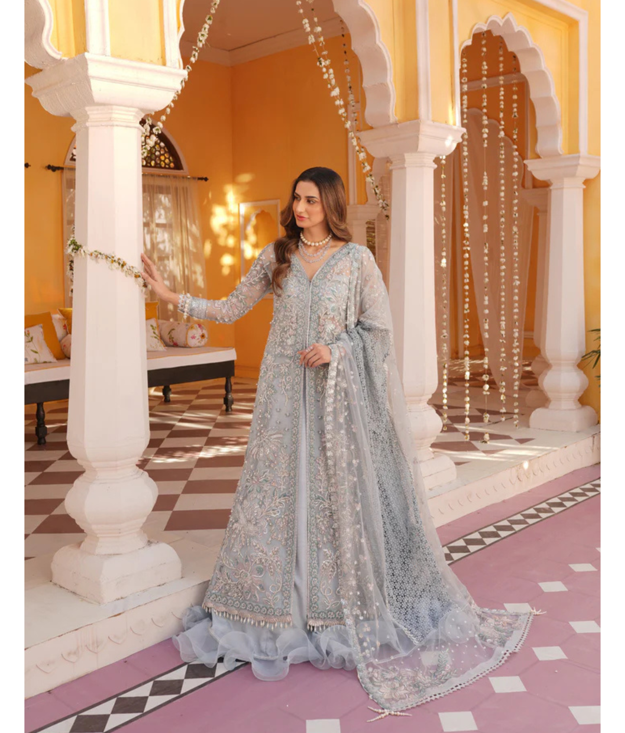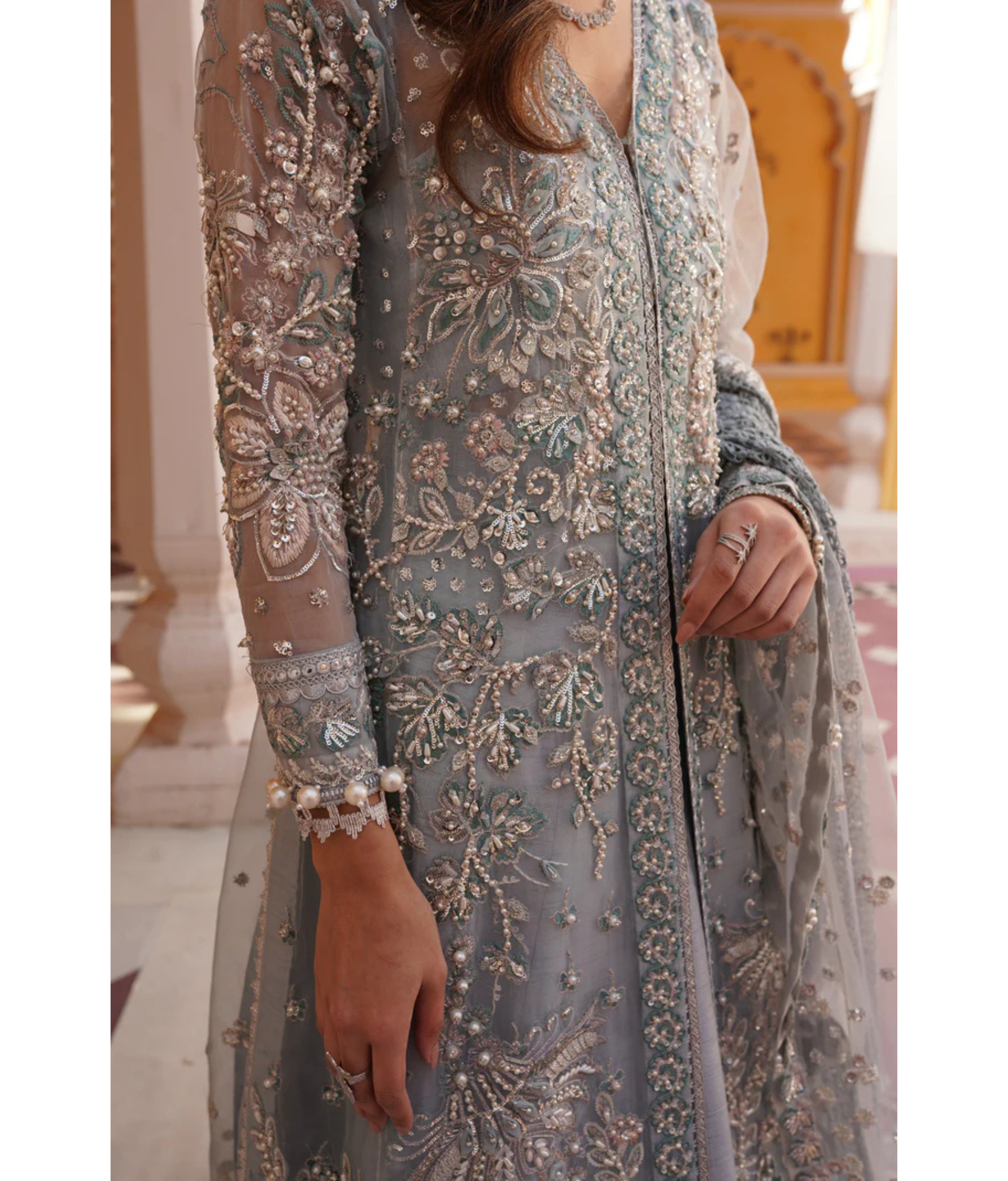 Mariam Malik introducing this beautiful dress crafted with the finest ice blue organza fabric, exquisitely adorned with intricate embroidery and meticulous handwork. This elegant ensemble effortlessly blends traditional motives with contemporary designs. “Mahi Mir” is a true work of art, meticulously crafted with attention to every detail. It is perfect for special occasions, formal events, or as a statement piece for those seeking to make a lasting impression.