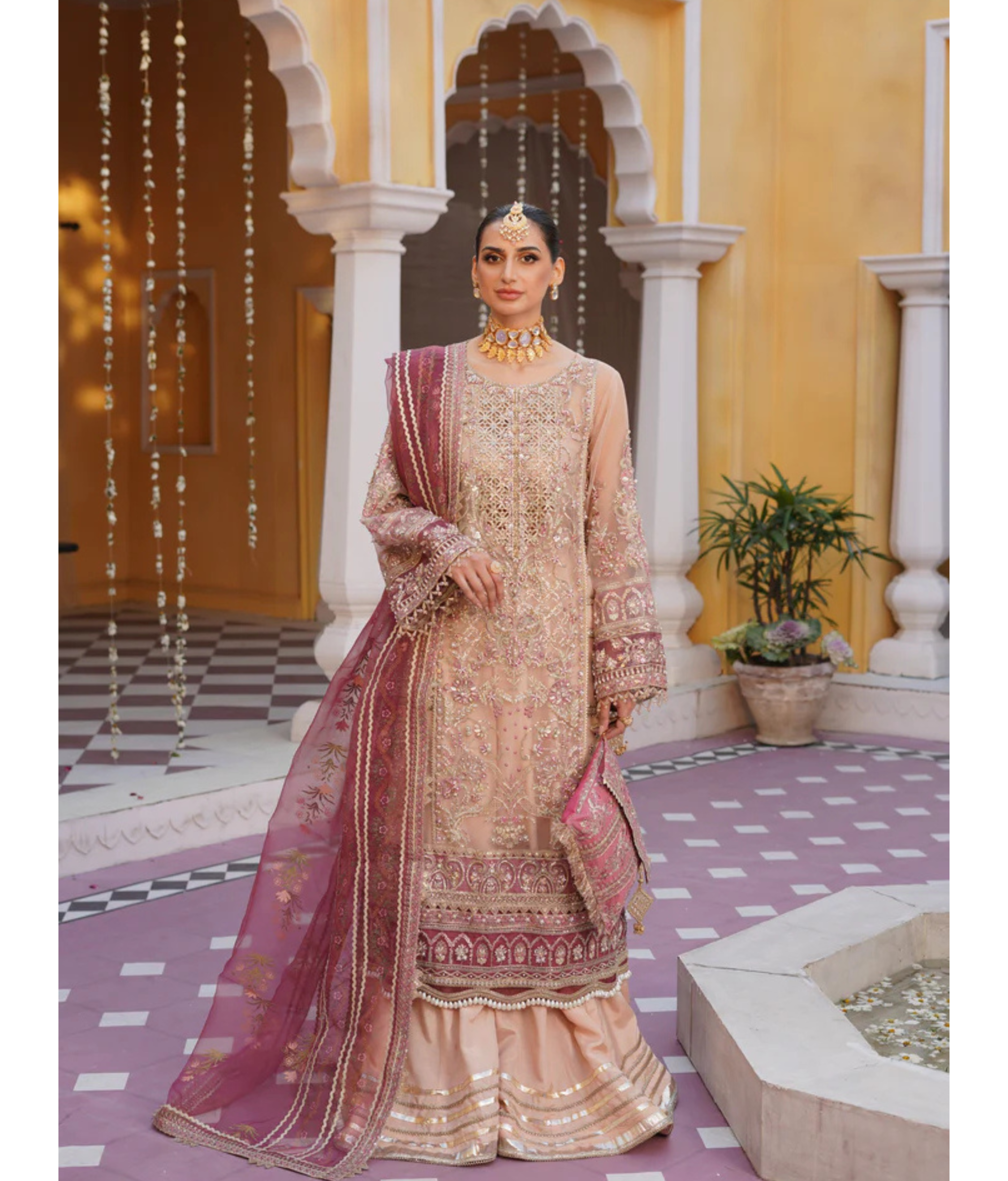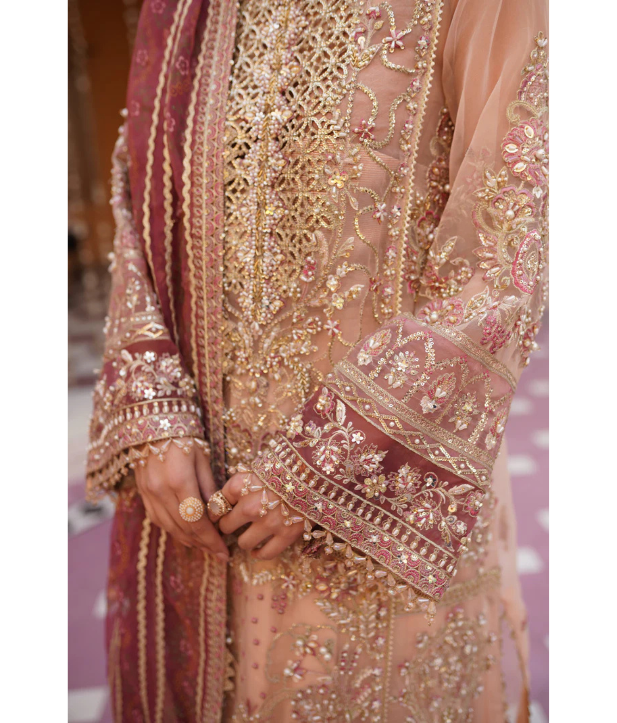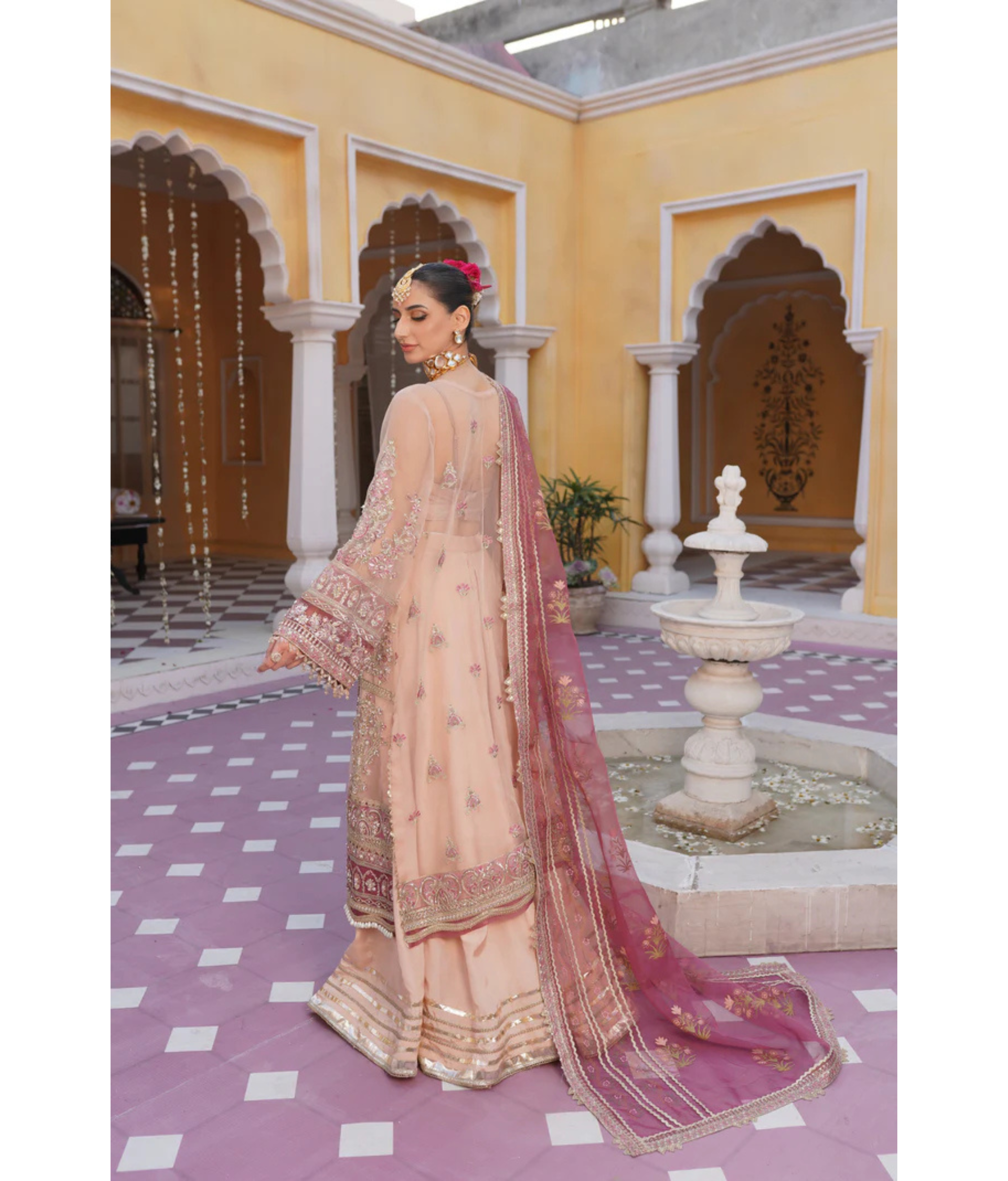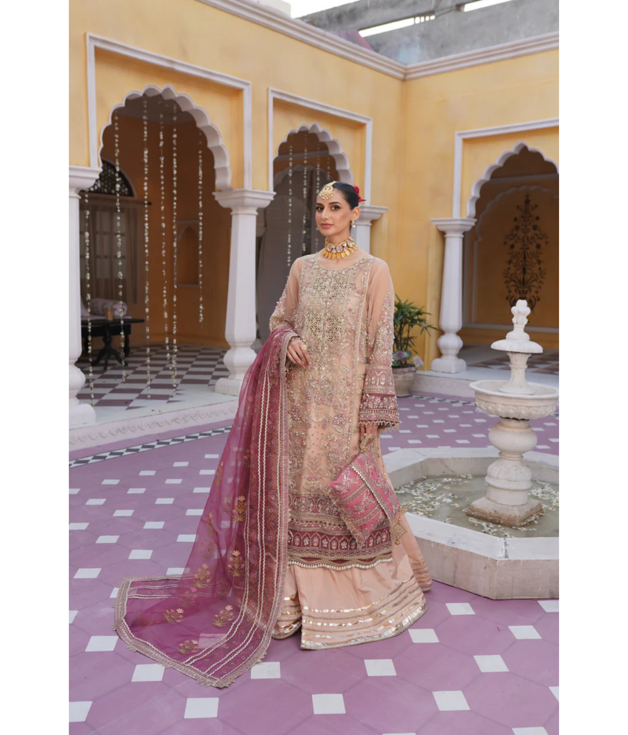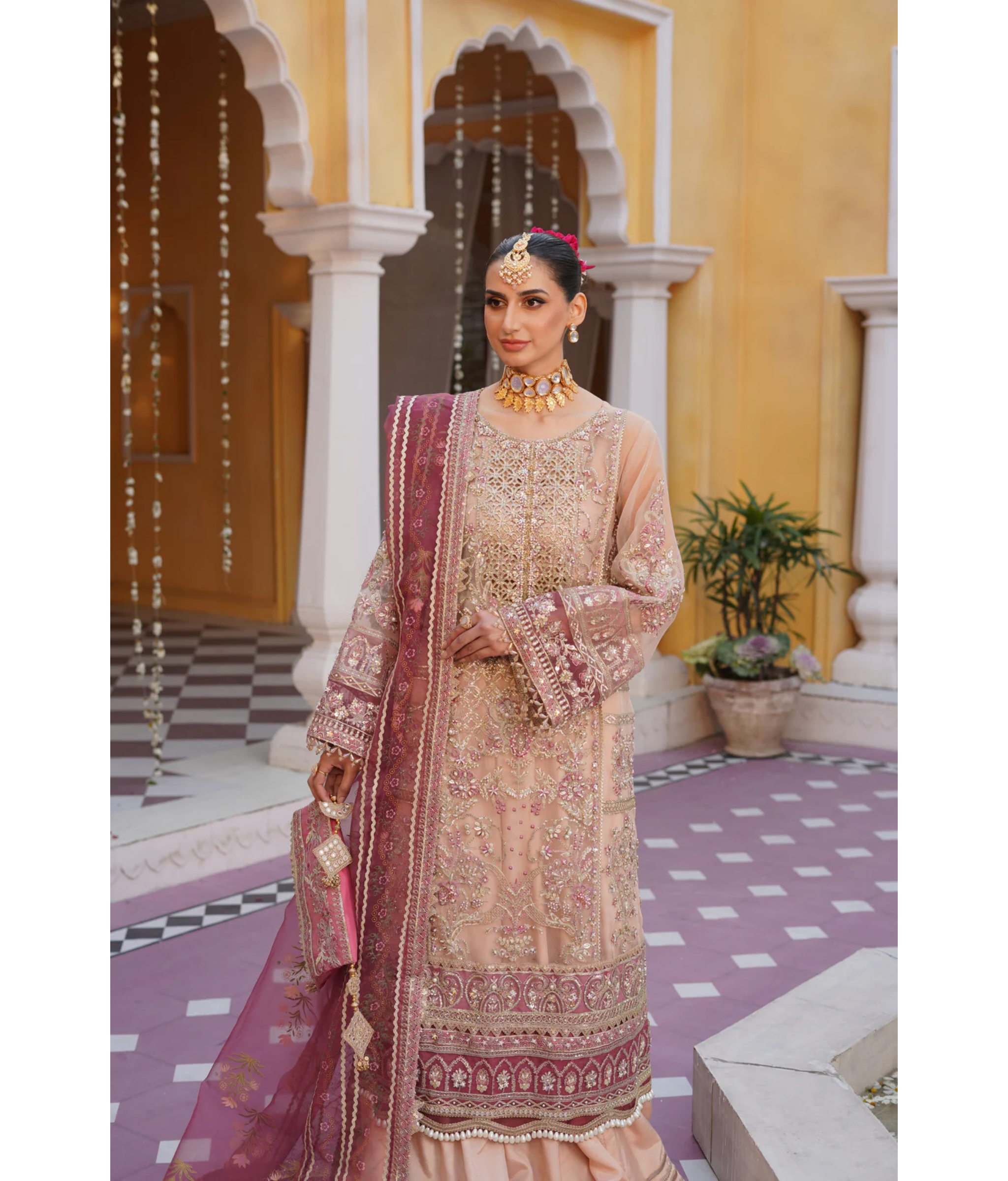 Tea pink pishwas crafted with exquisite artistry. Made from luxurious organza fabric, this gown radiates elegance and grace. The intricate handwork embroidery adds a touch of opulence, elevating it to a true masterpiece.