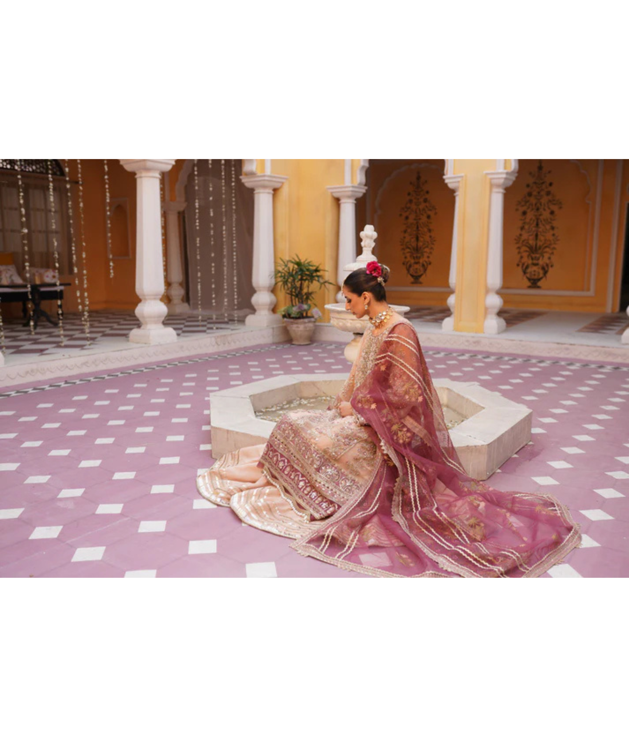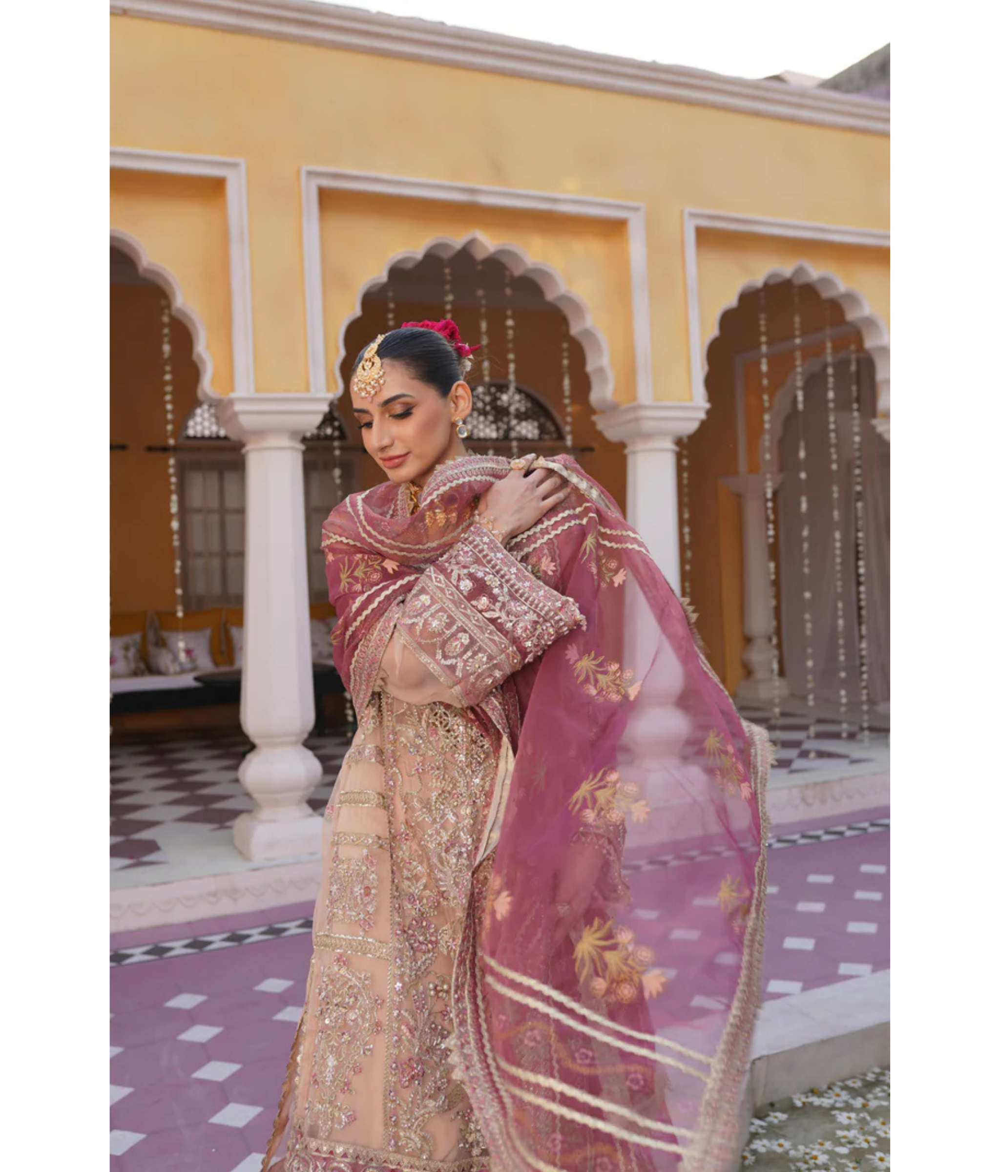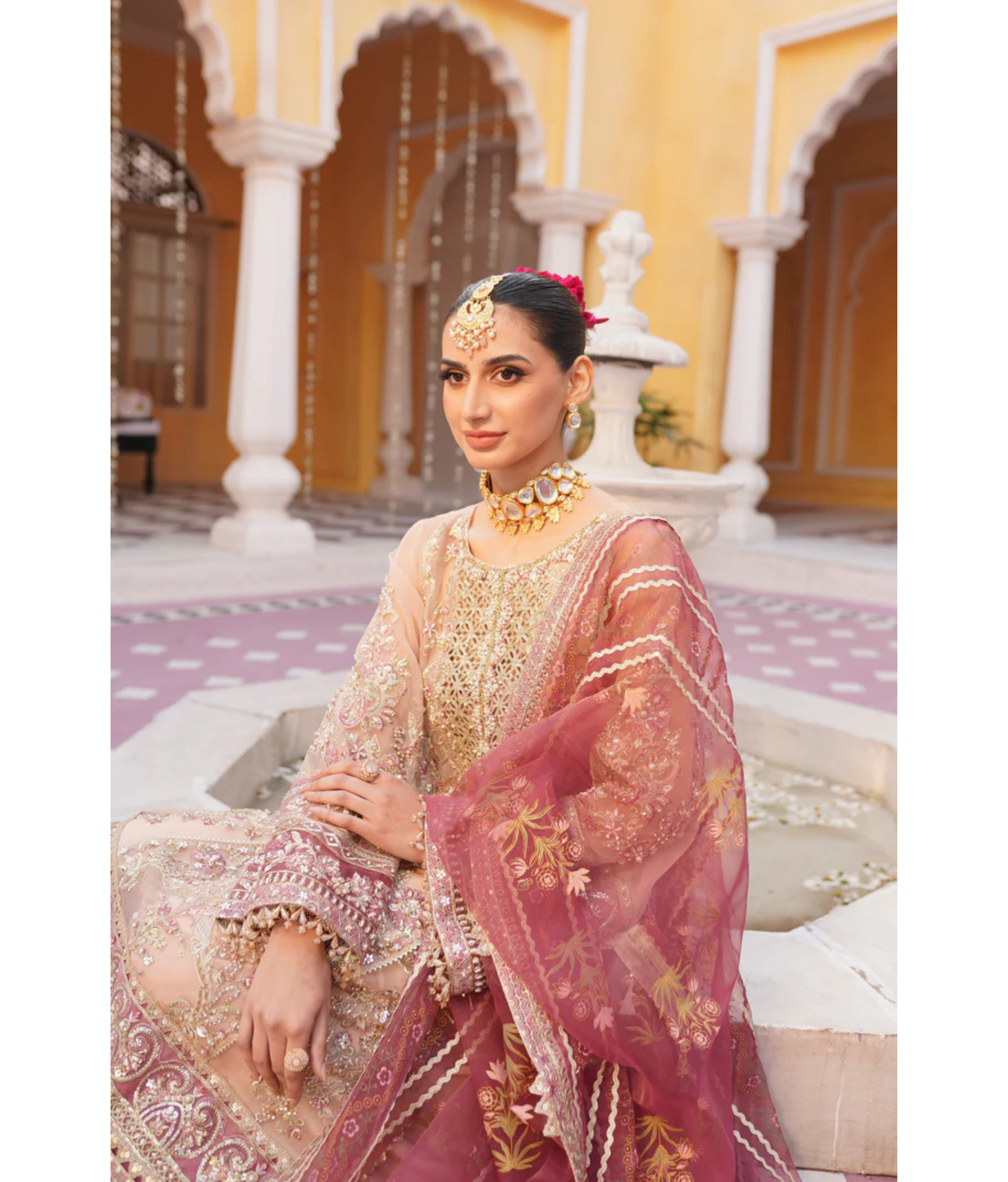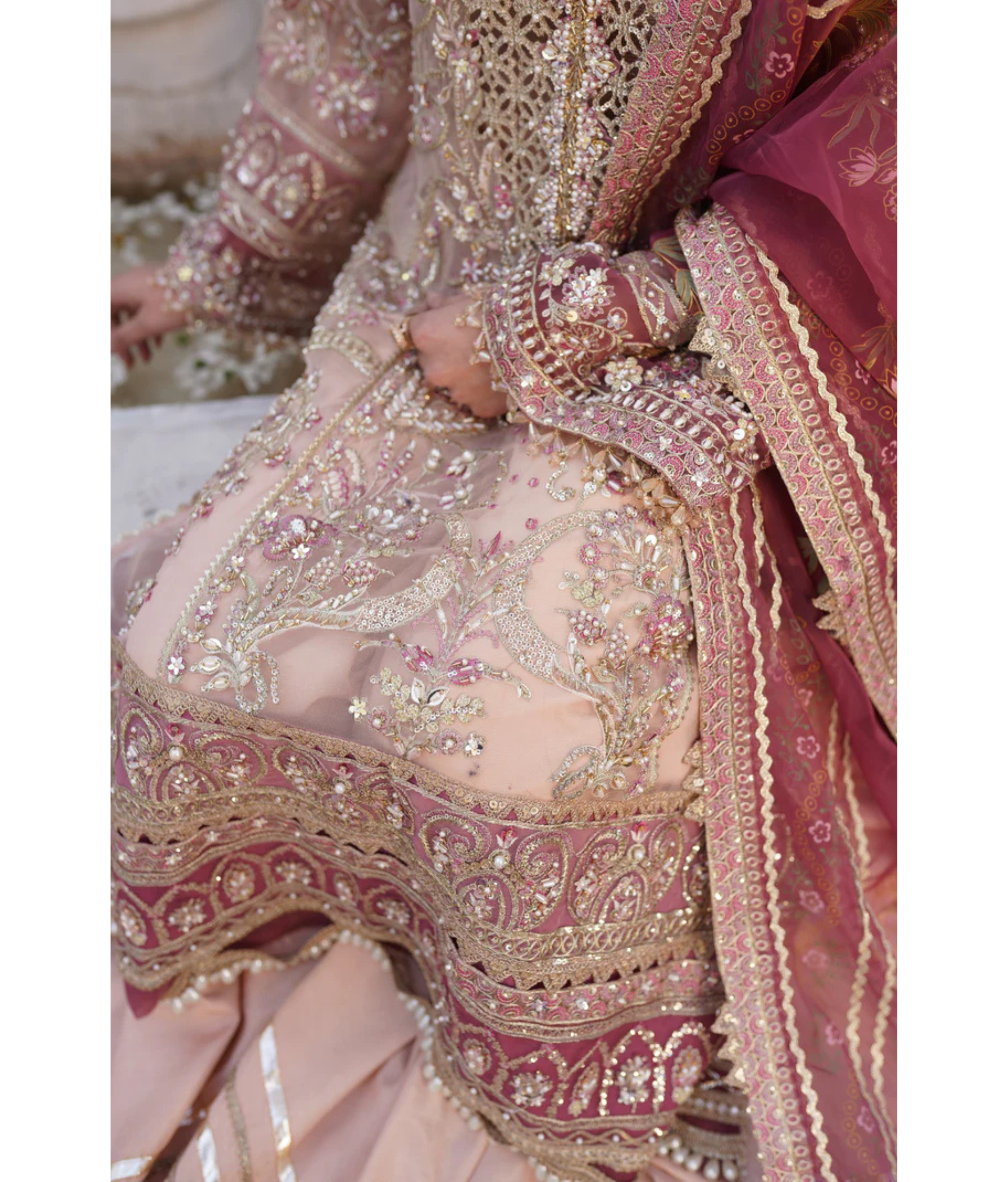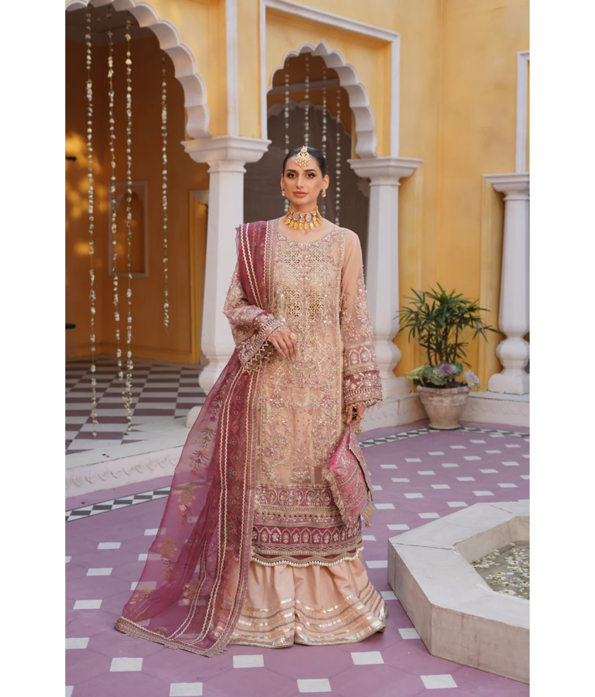 Tea pink pishwas crafted with exquisite artistry. Made from luxurious organza fabric, this gown radiates elegance and grace. The intricate handwork embroidery adds a touch of opulence, elevating it to a true masterpiece.