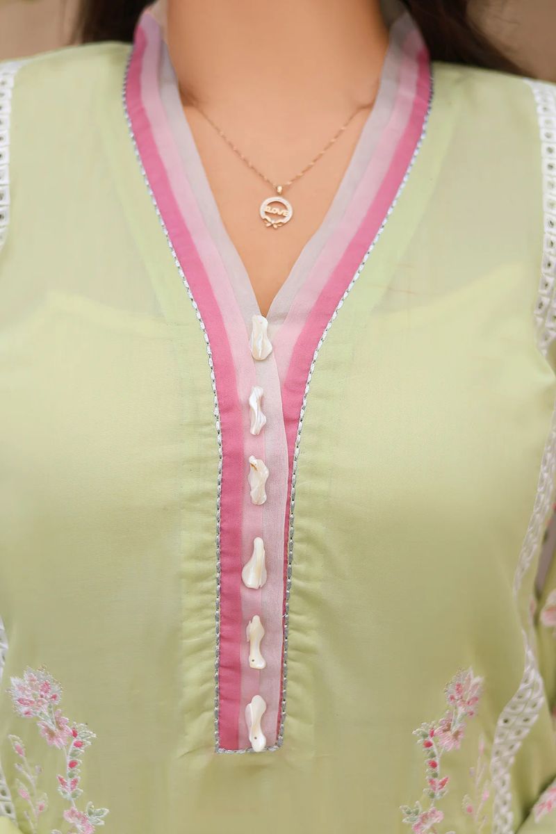 A pistachio dream woven in soft floral vines, touched with pink and ivory threads, tilla, and schiffli textures. The sheer dupatta blooms with vivid florals and bold borders — a quiet celebration of spring.